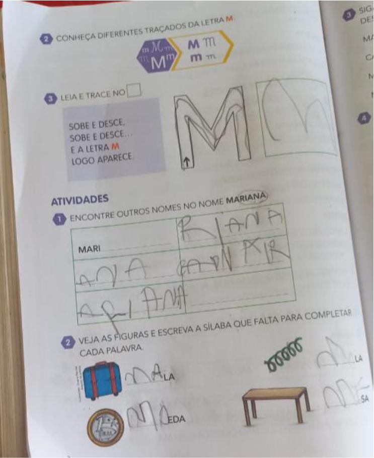 As estratégias utilizadas em sala de aula têm um impacto decisivo na aquisição de conhecimento dos estudantes surdos. A diferença no engajamento por parte de José e Maria em atividades que tinham recursos imagéticos como base ou suporte em relação a atividades que não tinham, ficou explícita no segundo dia de observação. Neste dia, a proposta de atividade era voltada a palavras iniciadas com a letra M. Na primeira parte, os estudantes escreviam palavras de acordo com as imagens, como “moto” e “moeda”.