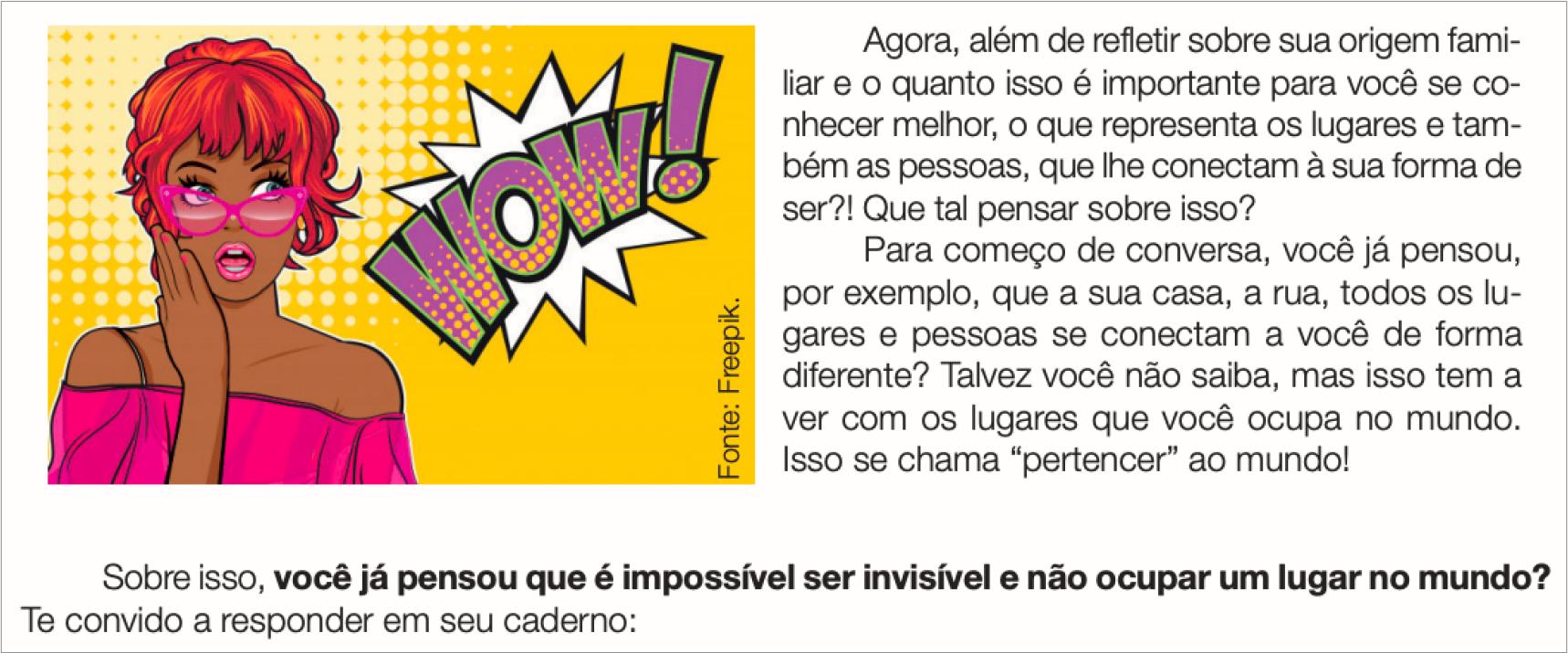 [i] Professor(a), como a sua turma entende o significado da palavra “pertencer”? E quais são os sentimentos ou as sensações, [sic] que fazem com que eles se sintam únicos? . . . Explique que cada pessoa possui sua história de vida e que ela começa a ser construída, [sic] antes mesmo do nascimento. Diga aos estudantes que não importa o que sabem e valorizam sobre a sua origem familiar, porque o mais importante é o que eles fazem com as informações, [sic] que possuem sobre isso. É importante, [sic] que todos tenham em mente, [sic] que os vínculos seguros e saudáveis, que os estudantes estabelecem com a própria origem familiar, [sic] são fundamentais para a construção do Projeto de Vida. (Currículo em Ação. Matemática, Tecnologia e Inovação e Projeto de Vida, n.d., p. 297, grifo nosso).