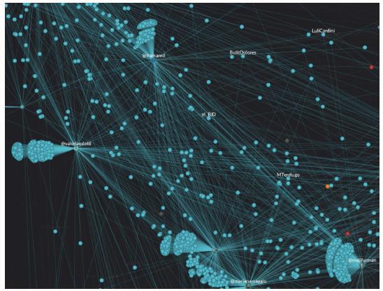 No caso do Uruguai, levando em consideração que dispúnhamos de pouca informação prévia, partimos dos resultados do questionário antes descrito, no qual se pedia aos docentes que identificassem pessoas que consideravam referências nas redes sociais. Em uma segunda etapa, a lista dessas referências foi processada com o software Graphtext, em busca de padrões e tendências para analisar sua influência em redes sociais e estudar a estrutura e as dinâmicas de conexões entre as pessoas usuárias. Trata-se de um programa que permite uma visualização interativa de redes e fornece as ferramentas necessárias para gerar gráficos dinâmicos e hierárquicos.