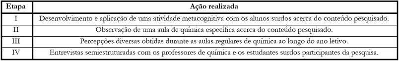 A pesquisa foi realizada durante o ano letivo de 2019, numa escola particular, com três alunos surdos do 3.o ano do ensino médio, fluentes em Libras. Teve como ponto de partida o conteúdo da química intitulado “interações intermoleculares”, contemplando quatro etapas (Quadro 1):