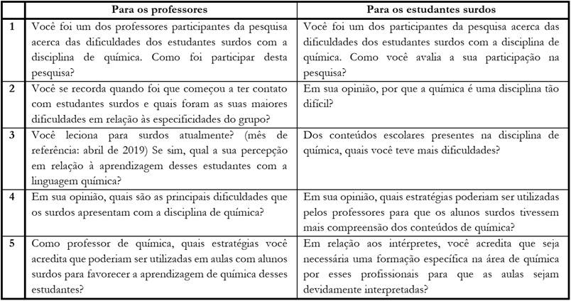 As entrevistas com os professores de química foram realizadas de forma individual, em dias e horários distintos. Foram feitas cinco perguntas objetivas, mas foram consideradas as manifestações espontâneas que não estavam no esboço. As entrevistas com os estudantes surdos também foram concebidas de forma individual, em dias e horários diferentes. Para eles, também foram realizadas cinco perguntas objetivas, e manifestações espontâneas foram amplamente consideradas (Quadro 2).