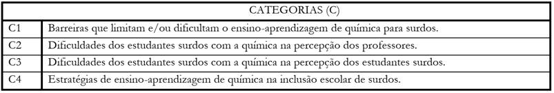 A professora acrescenta ainda que “[...] não podemos nos esquecer de que para os surdos é necessário que a lousa esteja organizada com cores, diferenciando processos para que eles percebam o que está acontecendo”. Para os professores, as barreiras no processo de ensino-aprendizagem (C1) estão relacionadas à complexidade existente na própria química. Ao longo das entrevistas, a palavra dificuldade estava muito presente em suas falas, tanto que concluímos que essa percepção por si só já configurava uma nova categoria, neste estudo designada como C2.