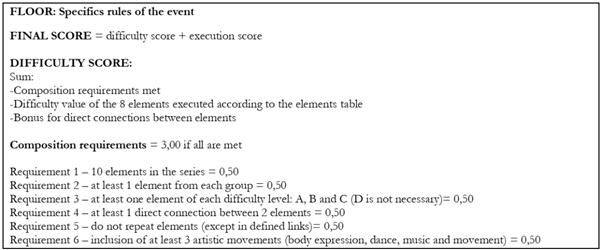 AG is a sporting modality belonging to the technical-combinatorial category, which takes into account the quality of the action/movement, according to pre-determined standards, which are compared to define the winner (González, 2004, 2006). Unlike practices that are characterized by the comparison of results with quantitative records that are easily perceptible by the spectator - such as, for example, a ball reaching na aim (soccer, basketball, handball etc.) or an athlete crossing the finish line (running events in athletics, swimming etc.) -, the judgment of the gymnast's performance comes from the aesthetic appreciation of the movements. The evaluation criteria for a series of AG are complex, as they involve both additions and deductions in the score, considering the degree of difficulty of the elements and the execution errors. The gymnast's final grade is composed of a combination of objective (technical) and subjective (expressive-artistic) parameters, as pointed out by Oliveira and Bortoleto (2009) and Roble, Nunomura and Oliveira (2013).