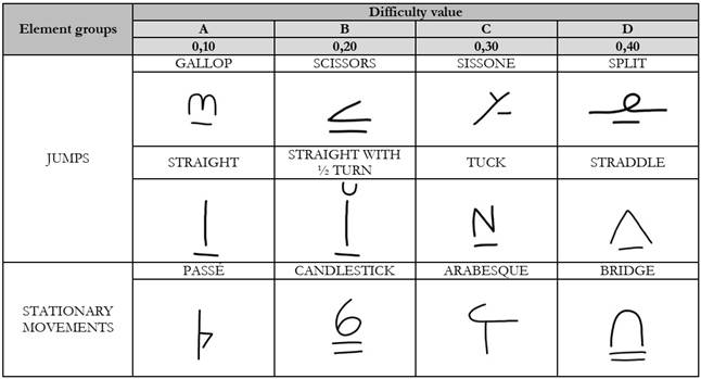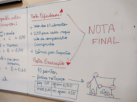 Research professor: [...] we sat in front of the board to define the jumps and their respective values. We decided that we would have the jump without and with the table, since two students were still unable to do jumps on the table, so that everyone would have the chance to participate in this test. To define the execution discounts, it was necessary for some students to demonstrate, again, how they were executing the jumps and, based on the aesthetics, how much they could extend their knees, elbows, toes etc., we determined the discount parameters (FD5).