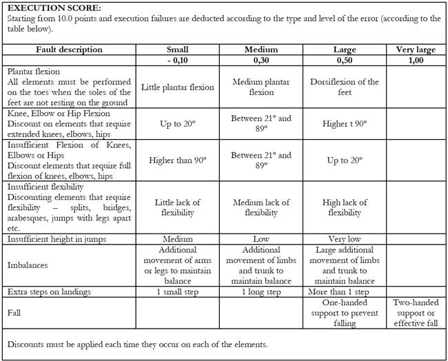 Research professor: [...] we defined the requirements for the composition of the floor and beam: number of elements in the series, how many from each group and value, artistic elements etc. The students negotiated a lot, demanding points that would allow the less skilled ones to be able to create a series with all the requirements. We also talked about execution discounts, and, at the same time as they demonstrated how much they could raise their legs during the arabesque move, extend their knees in the star, remain still in the handstand etc., we were determining what would be considered a small, medium, or large error (FD7).