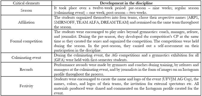 In the regular season, the students chose to hold the competitive event in a single day, in which, in addition to the AG competition by team, by apparatus, and individual all-around, a GFA choreography show was held with the students of the first semester. All gymnasts were awarded medals according to their placement (1st to 4th or 5th place) in the team competitions (sum of the three highest scores in each event), by apparatus (best scores on vault, beam, and floor) and individual all-around (sum of the scores of all events) (week 10). In the post-season, students read bibliographical materials about SE and discussed the similarities and differences between the events: GFA (non-competitive), in which they had participated in the first semester, and the current AG (competitive). They also carried out a self-assessment on their participation and the knowledge acquired during the semester (weeks 11-12).