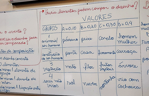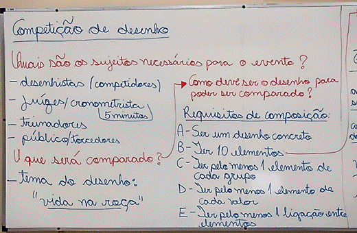 The dynamic began with generating questions to stimulate the collective creation of rules: “What are the subjects necessary for the drawing competition to take place? What will be compared? What should the drawing be like in order to be compared? What elements should make up the drawing? What values will each element have? Can we value connections between elements? How will we evaluate the flaws in the drawings?” (FD3). As the questions were answered, the rules of the game were determined, following the logic of the official AG CP: