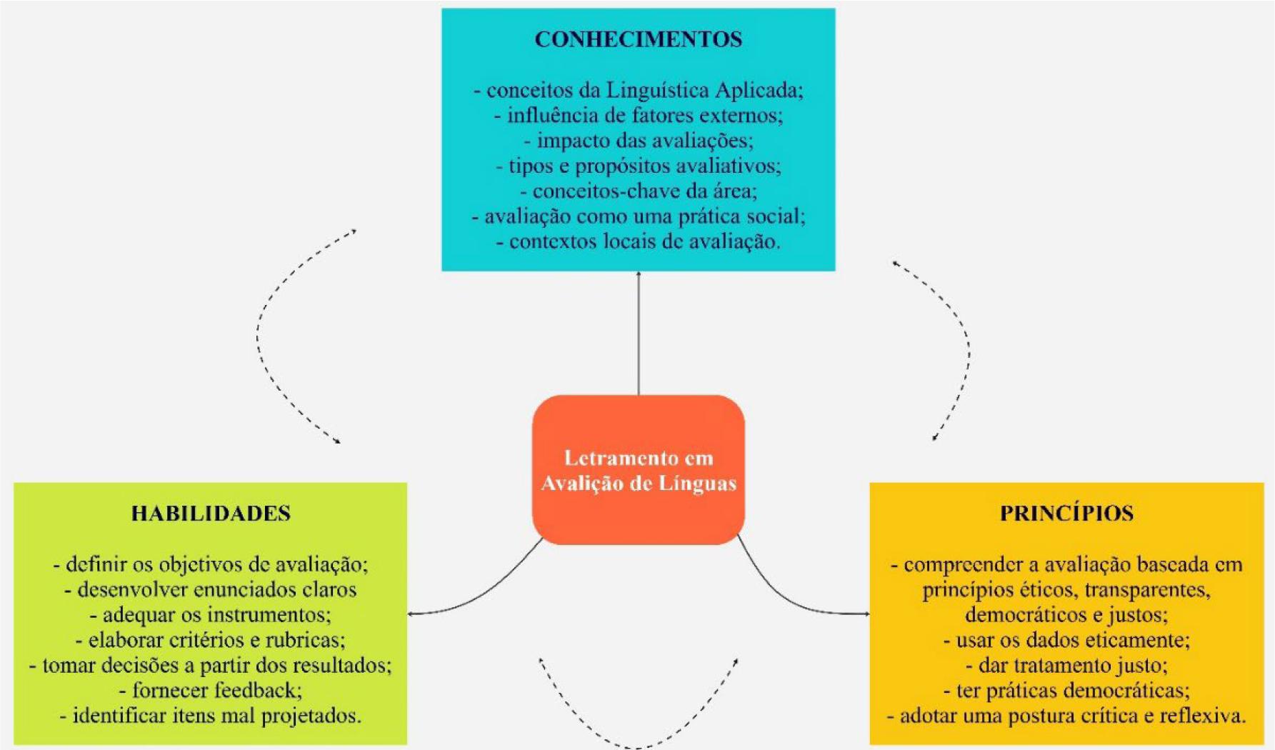 conhecimentos: a) consciência de questões da linguística aplicada; b) consciência sobre as teorias e os conceitos; c) conhecimento sobre o que é ser letrado em avaliação; d) consciência do contexto da avaliação de línguas;