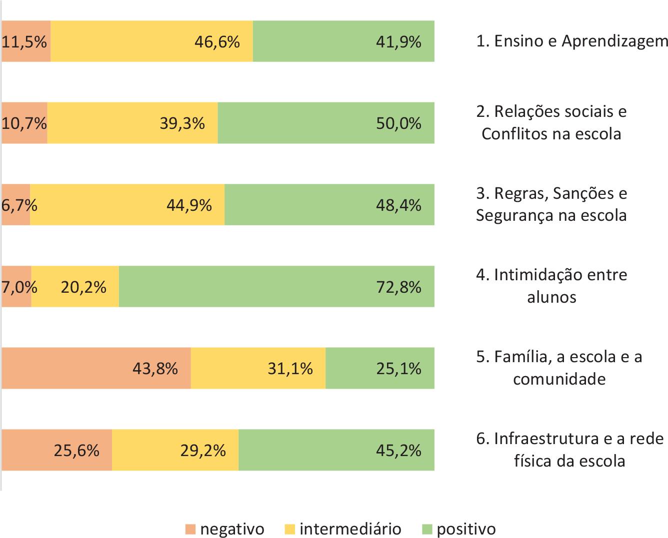 De acordo com as informações indicadas na Figura 1, podemos verificar que as percepções caracterizadas como negativas, por parte dos estudantes, apresentaram um percentual baixo, com exceção das dimensões 5 e 6 (Família, a escola e a comunidade e Infraestrutura e a rede física da escola), com 43,8% e 25,6% respectivamente. A dimensão 4 (Intimidação entre alunos) foi a dimensão com o maior percentual de percepções positivas. Contudo, por se tratar de uma dimensão muito sensível, pois pode envolver situações de sofrimento entre os estudantes, faz-se necessário identificar em quais itens estão indicados os percentuais negativos.