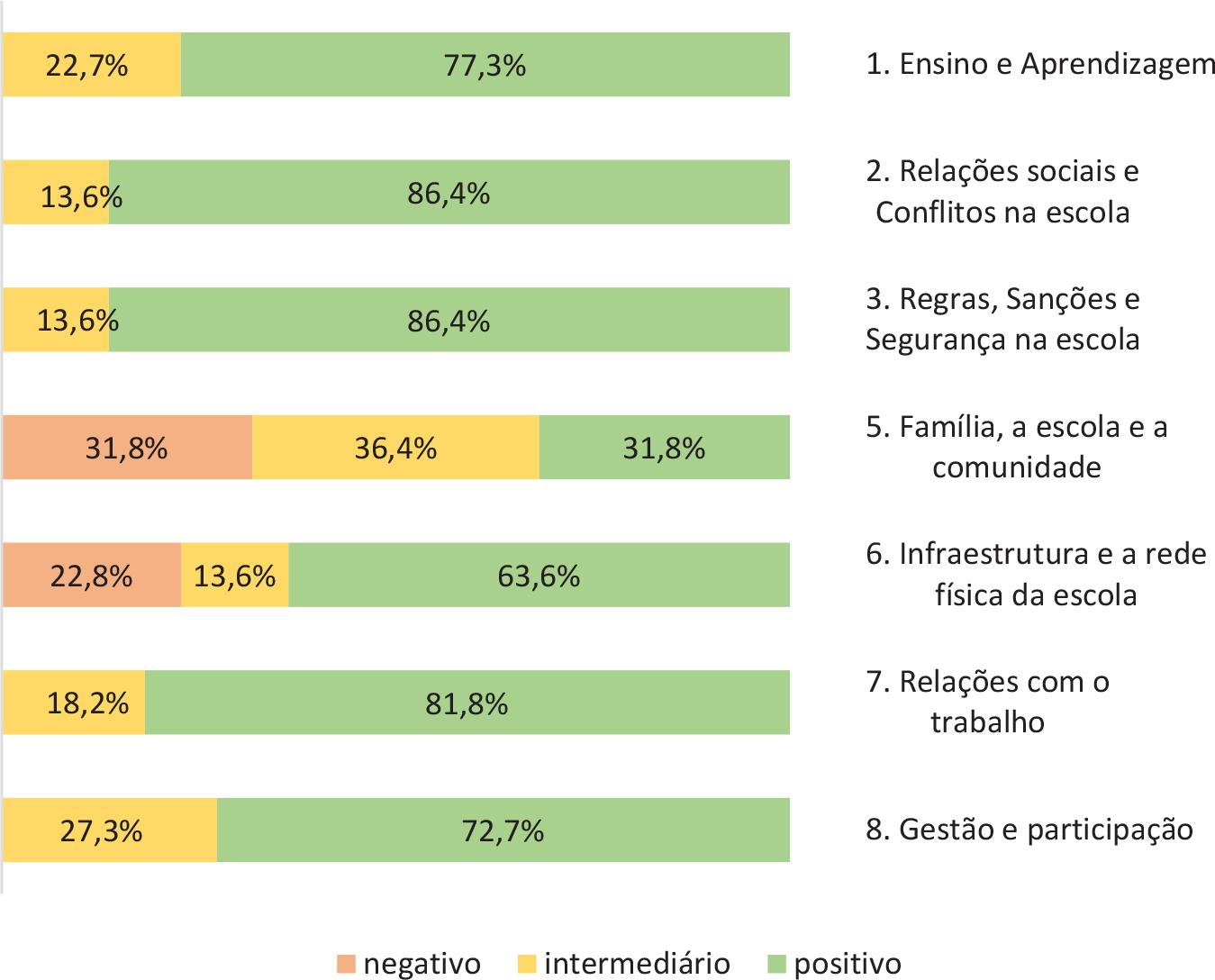 Dessa forma, apresentamos, nas figuras 1 a 3, os gráficos representacionais das percepções de estudantes, docentes e integrantes da equipe gestora sobre as oito dimensões avaliativas do clima escolar. Tais gráficos nortearam as discussões e reflexões com representação de todos os atores escolares nos seminários de devolutiva do diagnóstico do clima escolar.