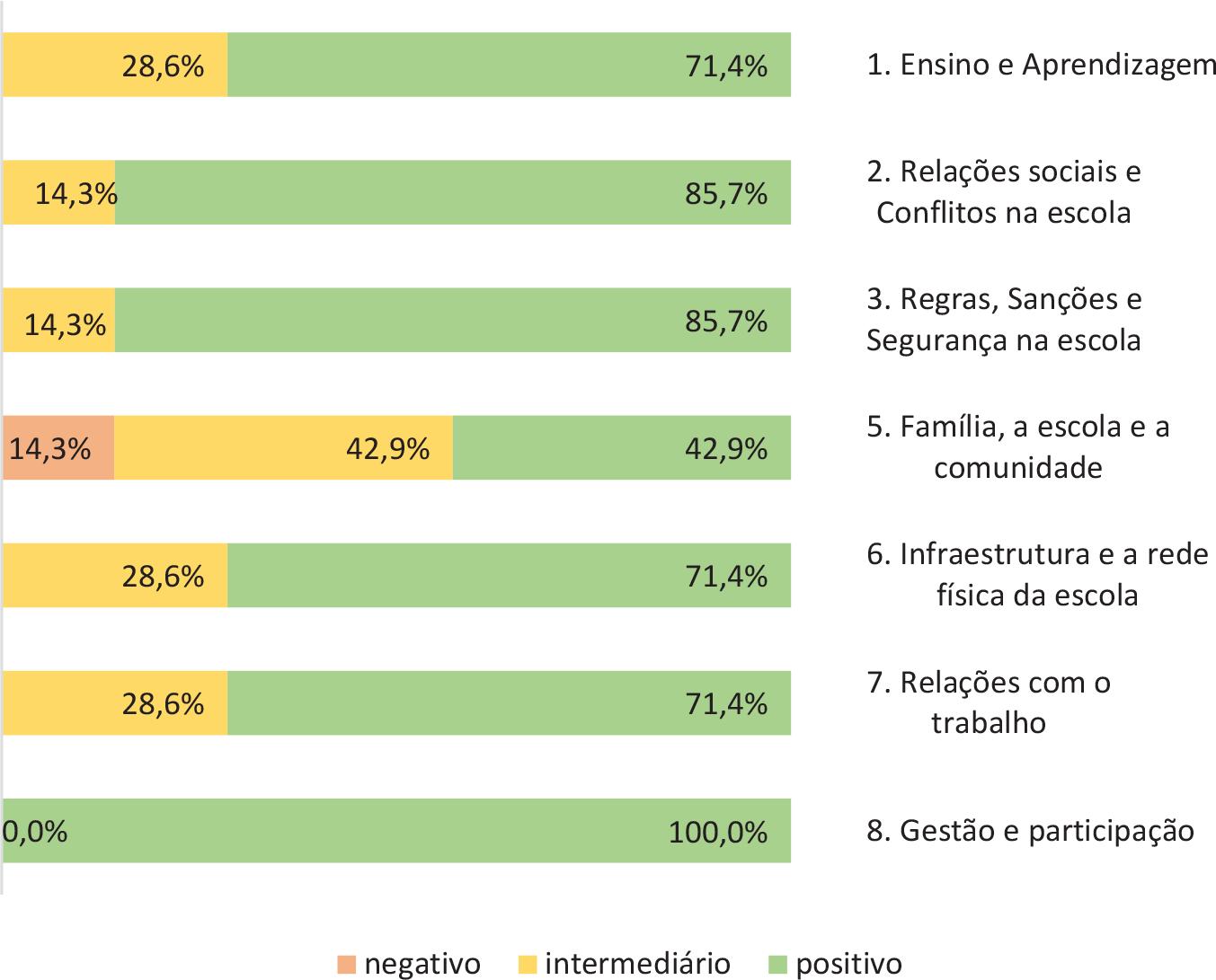 Com relação aos dados da equipe gestora da Escola A (Figura 3), podemos verificar que há predominantemente uma perspectiva positiva dos integrantes em todas as dimensões do clima escolar, com exceção da dimensão 5: Família, a escola e a comunidade, que apresenta 14,3% de respostas negativas aos itens avaliativos.