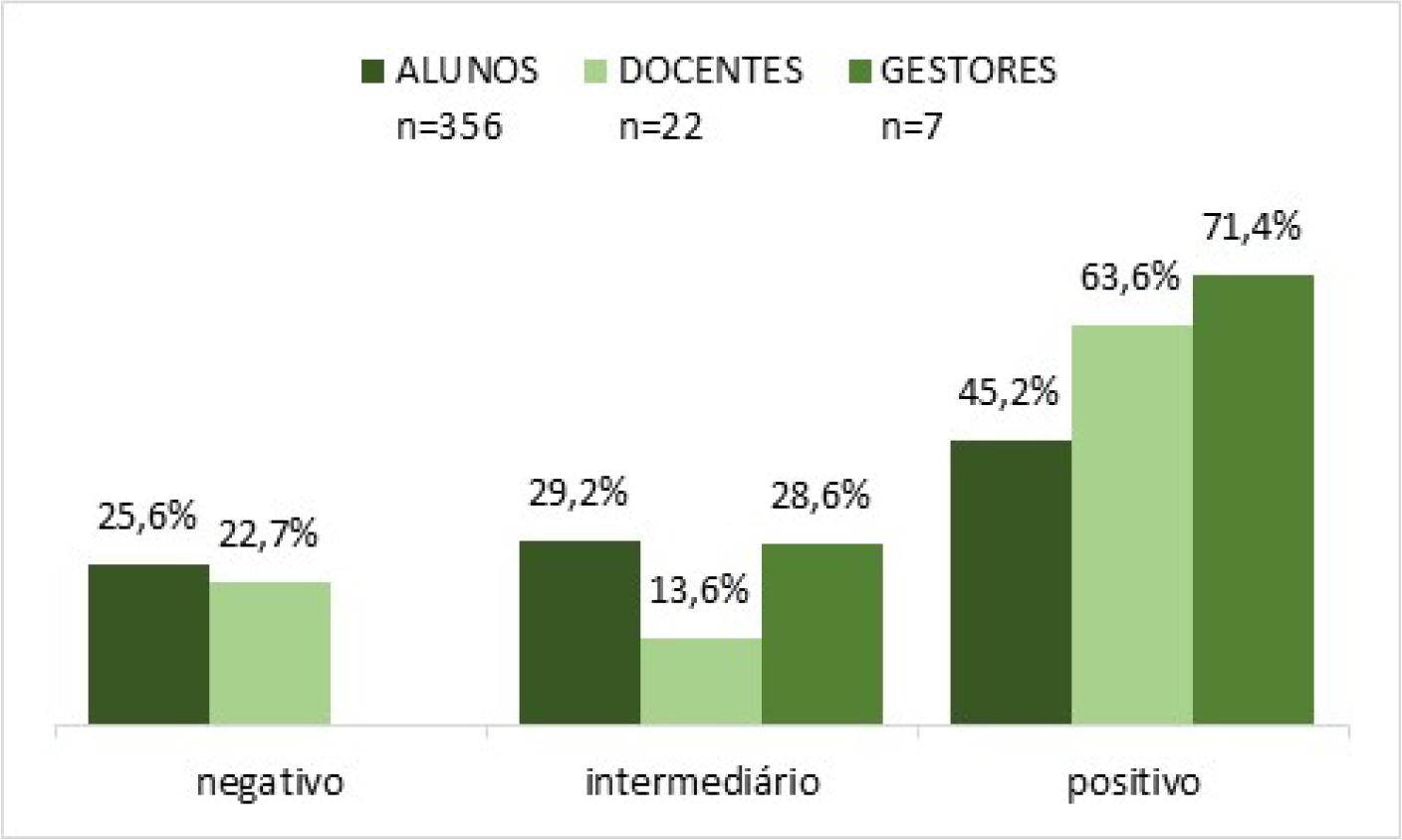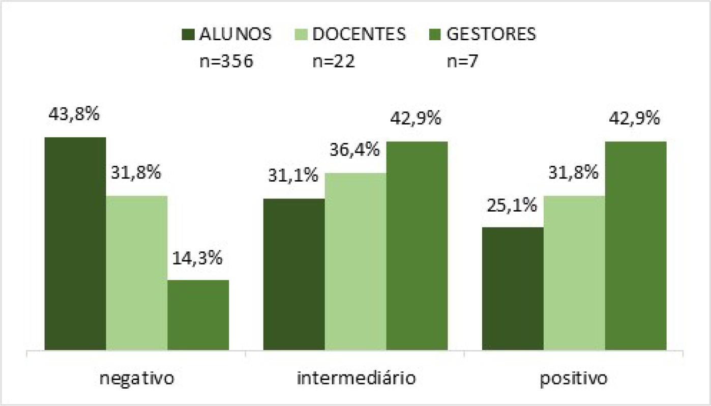 As análises dos dados foram feitas de forma quantitativa, adotando o programa IBM© SPSS© Statistics 22.0. Por meio desse processamento, foram gerados relatórios com análises descritivas gerais das frequências de respostas das variáveis categóricas - itens do clima escolar. Além disso, com base no cálculo da pontuação média obtida em cada dimensão, propusemos a codificação dos escores numéricos para dados categóricos e, com isso, dividimos os quatro pontos da Escala Likert em três subintervalos, aos quais foram atribuídos os níveis/nomenclaturas - negativo, intermediário e positivo. Desse modo, foram extraídas as frequências de avaliação dos níveis para cada uma das dimensões do clima, o que resultou em um diagnóstico do clima escolar da Escola A.