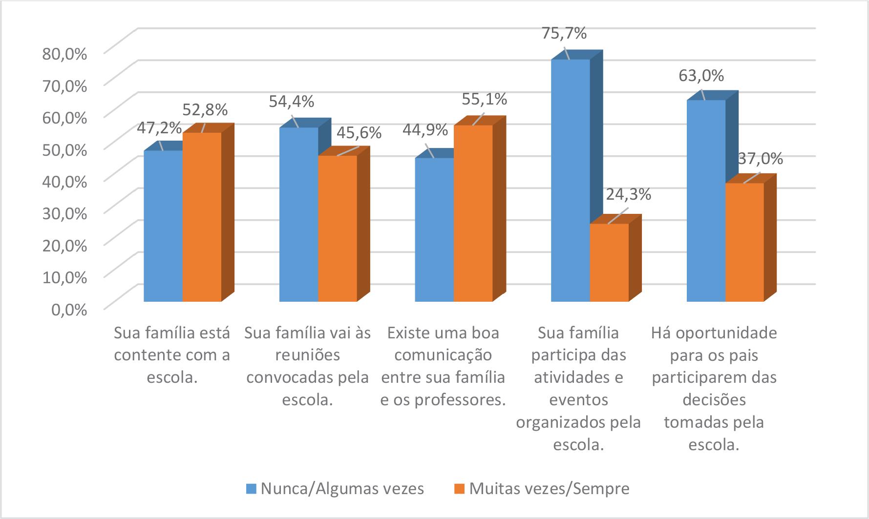 Por outro lado, faz-se necessário refletir junto com a comunidade escolar sobre pontos sensíveis que precisariam de um olhar mais atento voltado para a proposição de melhorias. É o caso, por exemplo, dos 75,7% dos estudantes que informaram que suas famílias não participavam de eventos organizados pela escola.
