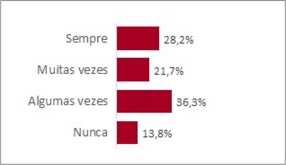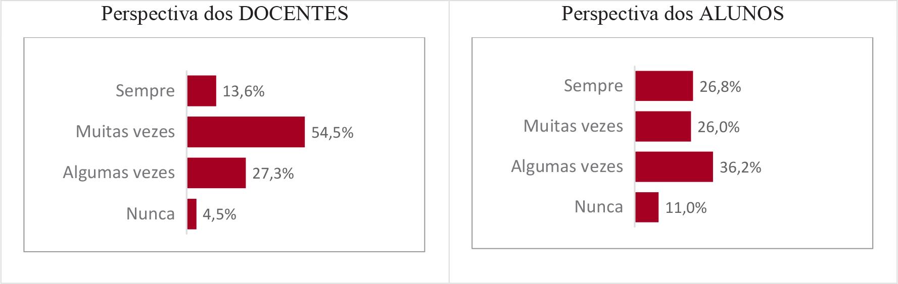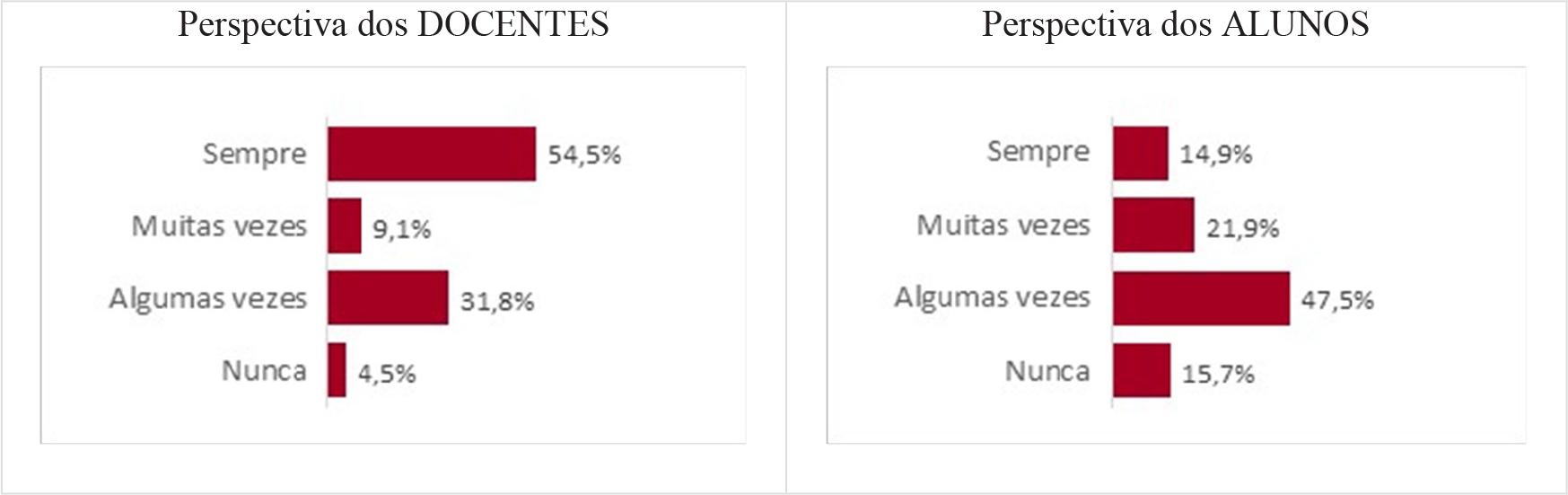 Na Figura 5 apresentamos alguns itens que foram selecionados da referida dimensão. Em tal representação, trabalhamos com os extremos das alternativas respondidas pelos estudantes na escala Likert, isto é, agrupamos as duas primeiras alternativas - “nunca/algumas vezes” -, bem como as duas últimas - “muitas vezes/sempre” -, a fim de demarcarmos as percepções negativas e positivas para cada item.