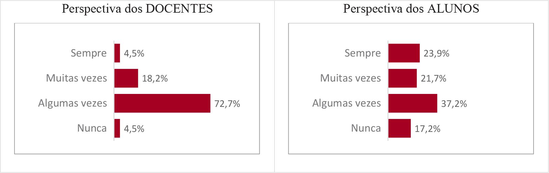 Na medida em que explicitamos a distribuição de respostas para as quatro alternativas, podemos observar mais detalhadamente como os estudantes e docentes percebem o mesmo fenômeno investigado. De acordo com esses gráficos, entendemos que, no geral, as percepções dos docentes são mais positivas do que a dos estudantes. Enquanto para 68,1% dos docentes as famílias estão sempre ou muitas vezes contentes com a escola, 11% dos estudantes apontam que suas famílias nunca estão contentes com a escola.