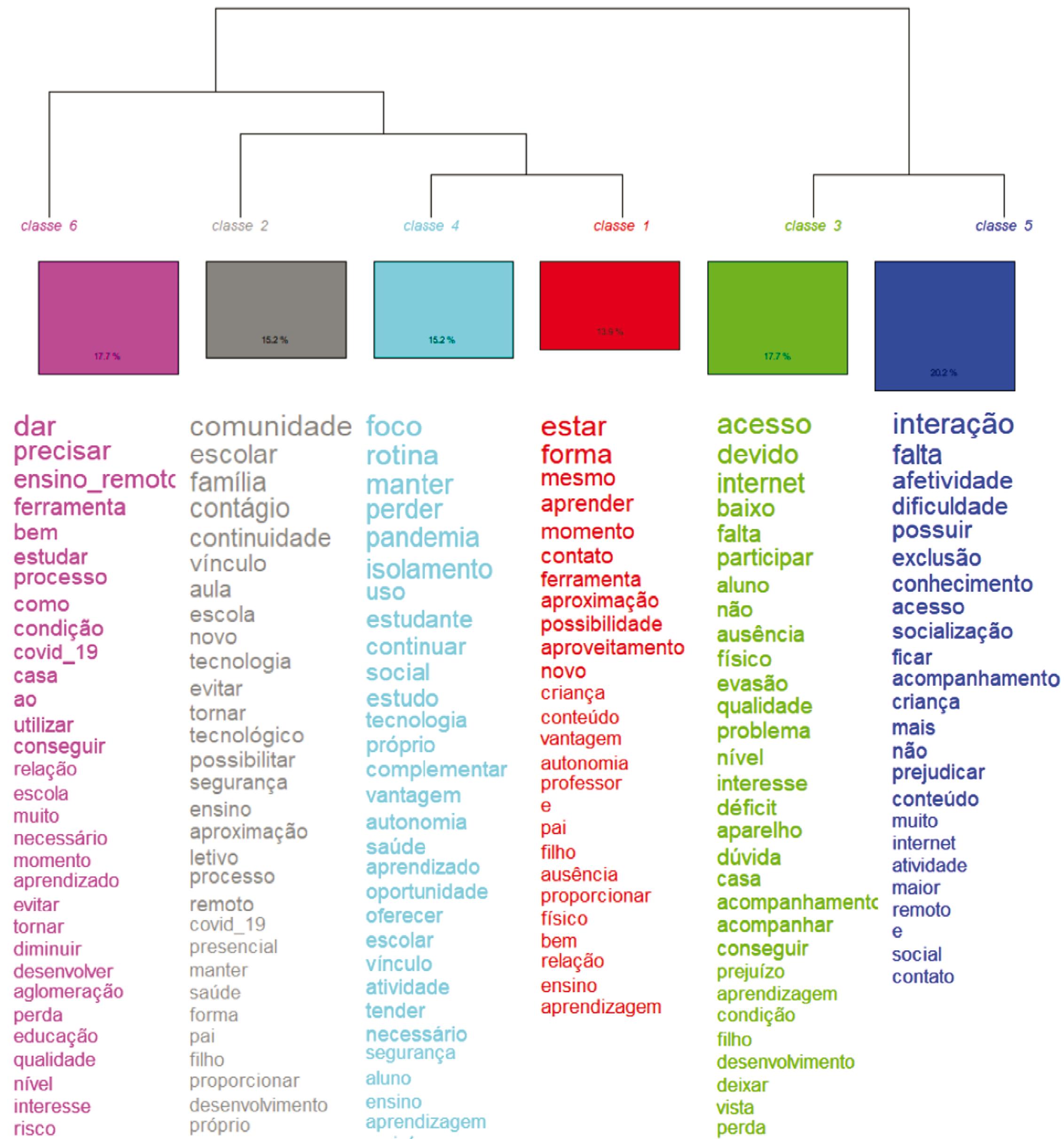A CHD classificou e colecionou os ST em razão da similaridade léxica, revelando-os em um dendrograma de seis classes. Em tal figura, quando lida da esquerda para a direita, a classe 6 (cor rósea) conecta-se, ao nível superior, com a ramificação da classe 2 (cor cinza), que, no que lhe concerne, une-se com o conjunto formado pelas classes 4 (cor azul-clara) e 1 (cor vermelha). Ainda, todo o agrupamento das classes 6, 2, 4 e 1 liga-se com o ramo das classes 3 (cor verde) e 5 (cor azul-escura).