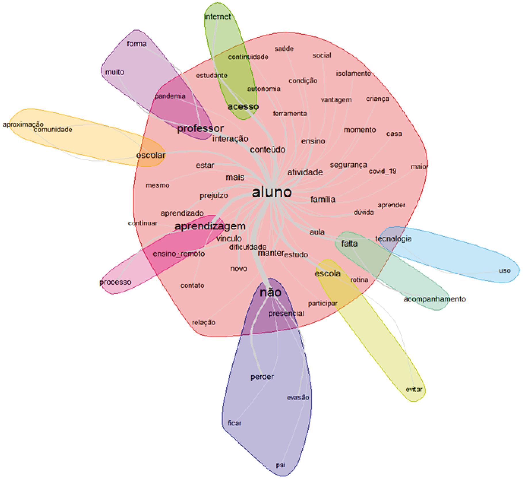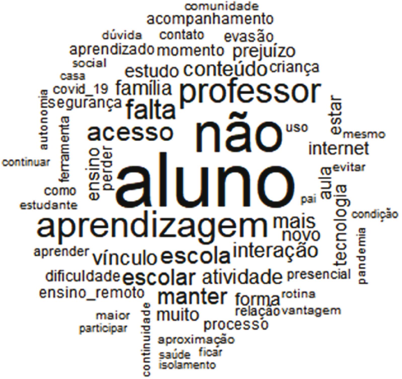 Em consulta à frequência das formas destacadas, constatou-se que “aluno” foi mencionado 115 vezes, seguindo-se “não” (f 78), “aprendizagem” (f 48), “professor” (f 45), “falta” (f 35), “acesso” (f 33), “escola” (f 27), “escolar” (f 25), “manter” (f 25), “vínculo” (f 24), e assim sucessivamente.