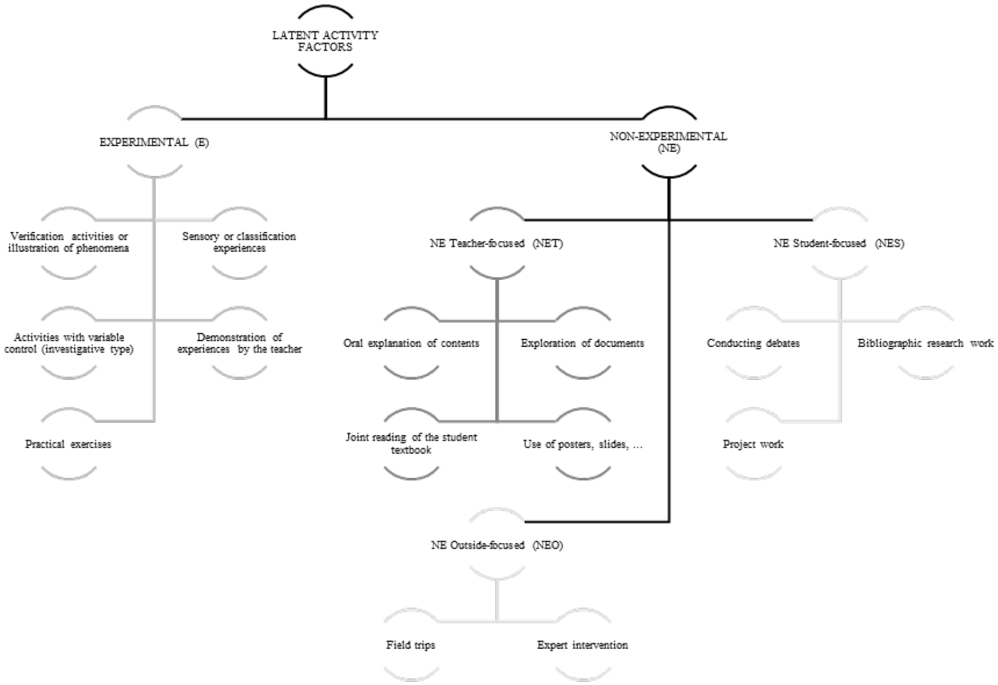 Category NE (non-experimental teaching practices) includes nine types of activities/strategies, within the subcategories: NET (teacher-focused), NES (student-focused) and NEO (outside-focused).
