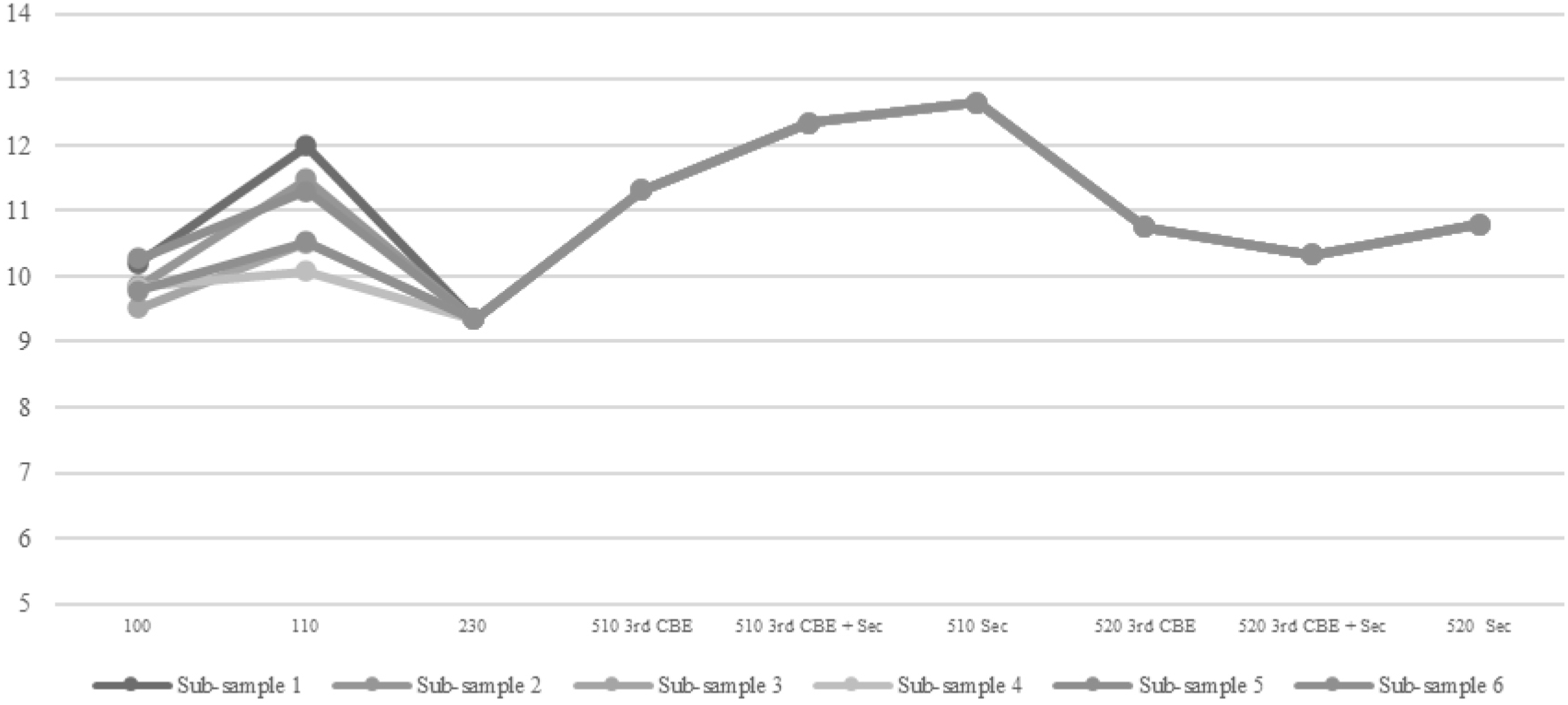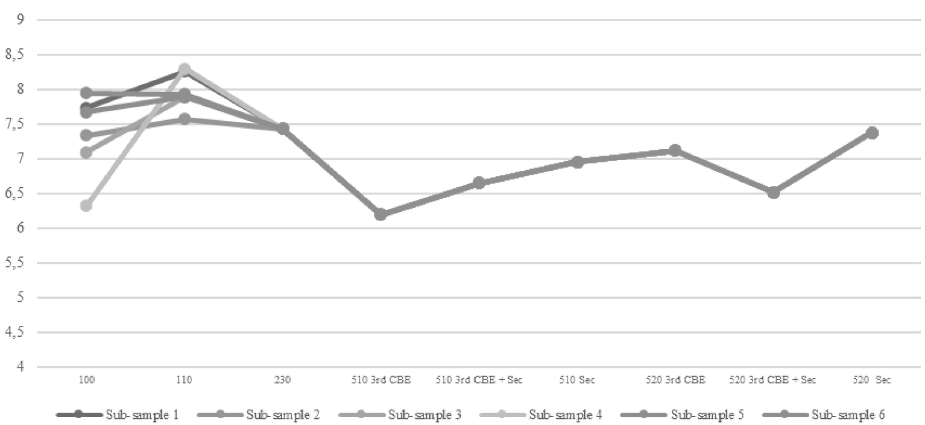 Chart 3 Averages of the factor Experimental teaching practices value obtained by each teaching group in the 6 sub-samples.