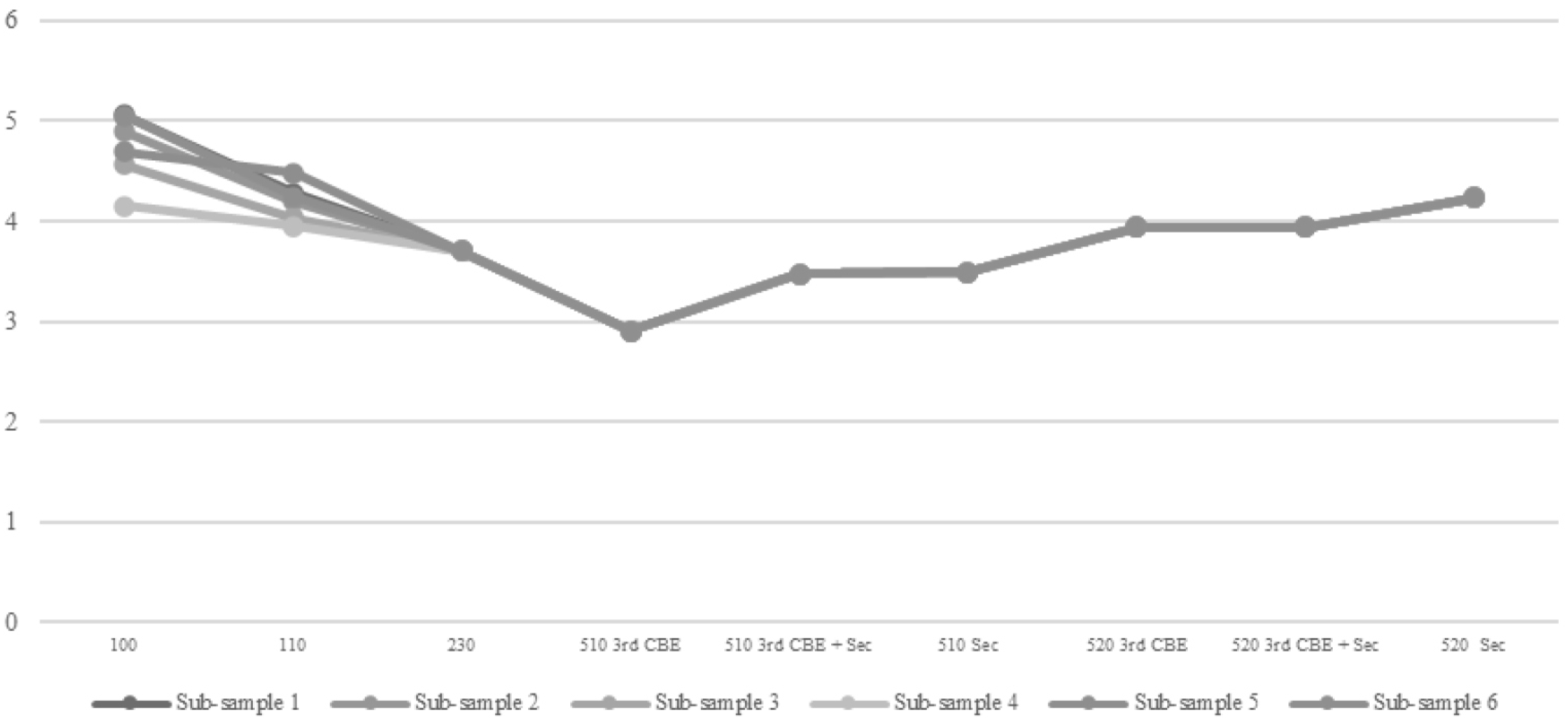 In view of the disparate number of teachers in each group, we chose to do six samples by bootstrapping, removing 15 teachers. Chart 3, 4, 5 and 6 show the descriptive result of this analysis.