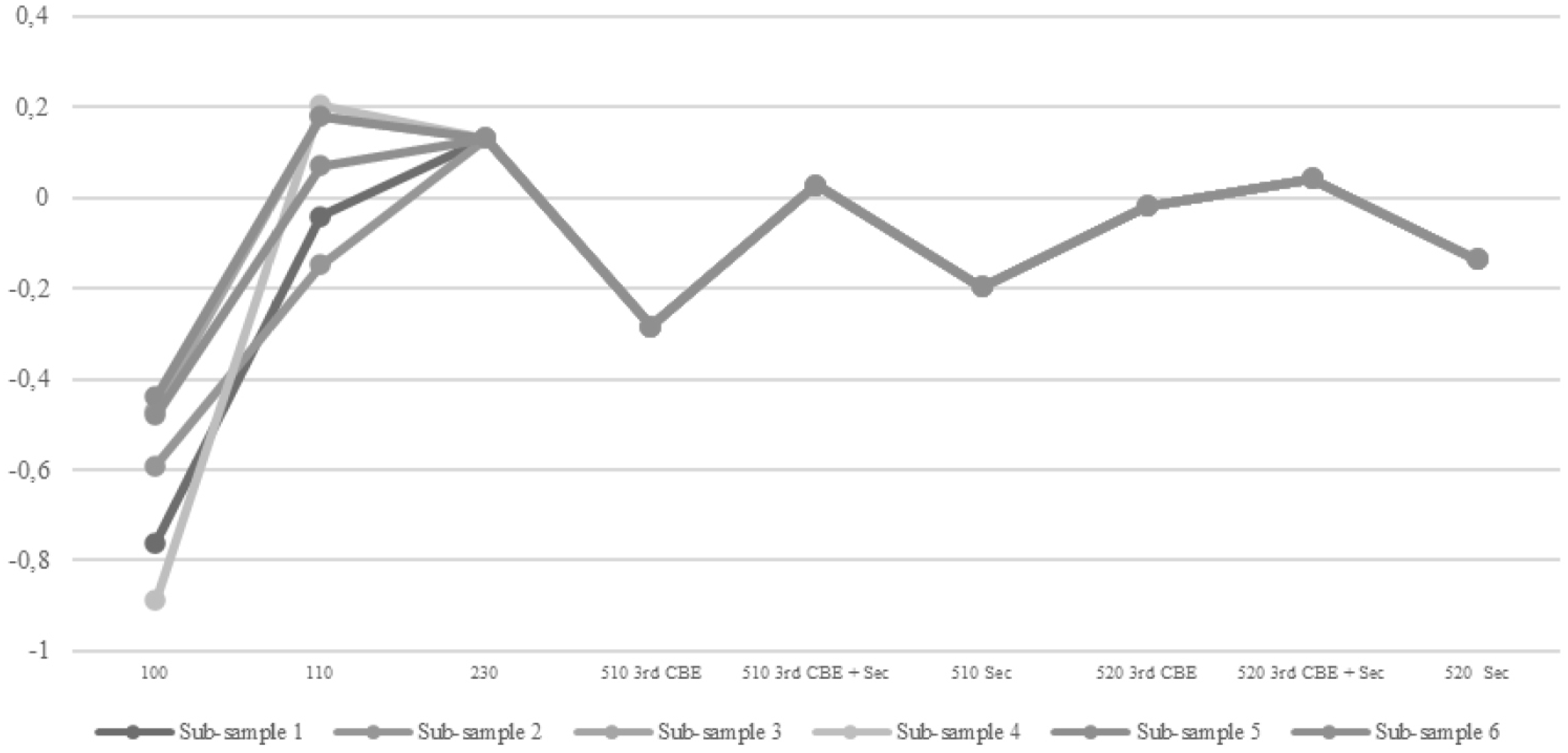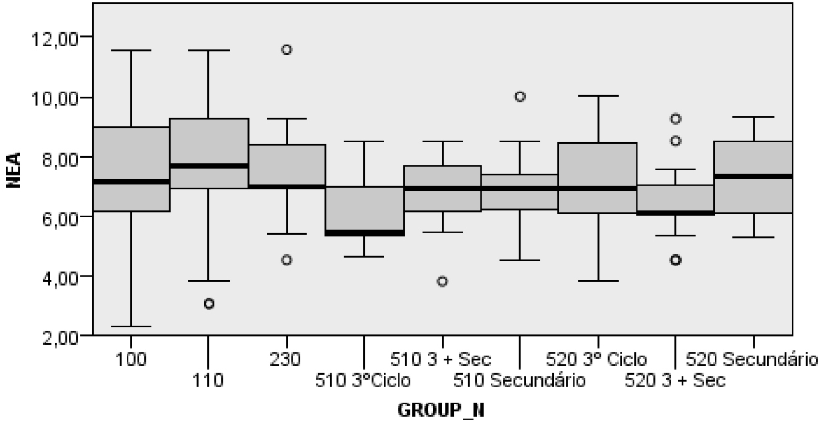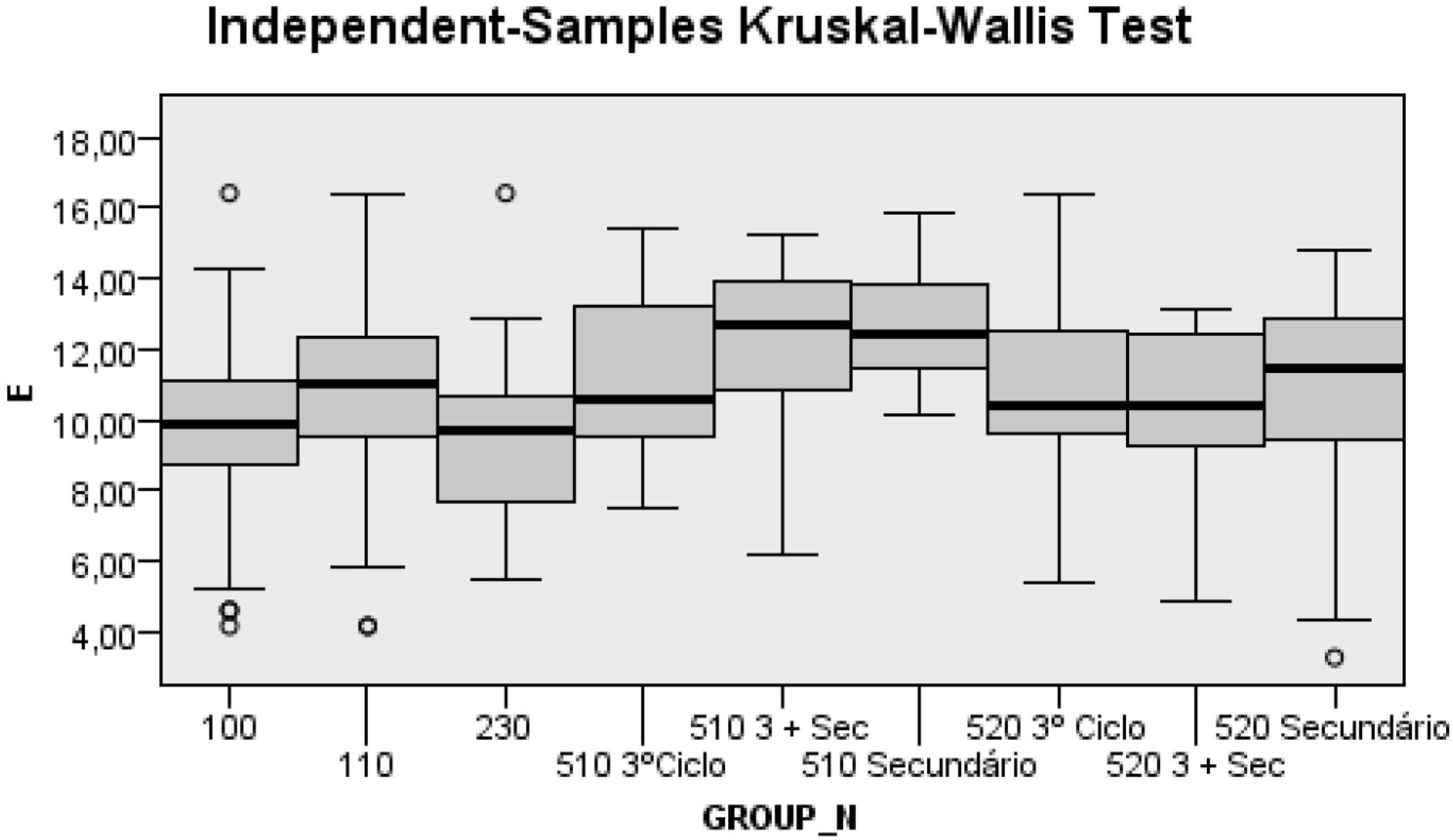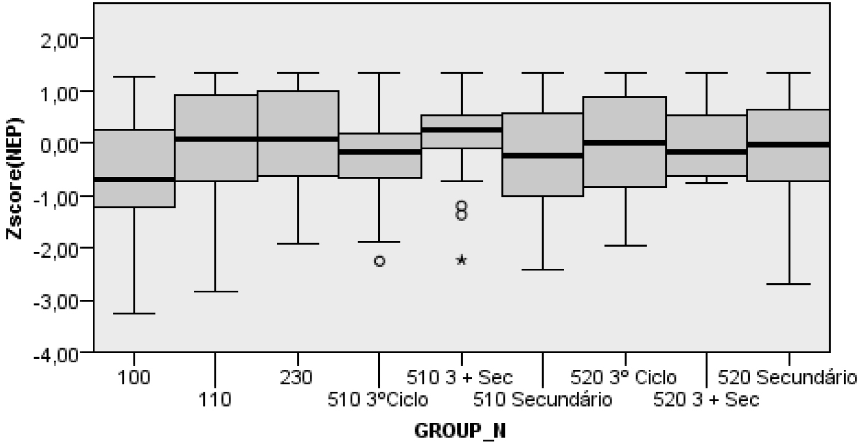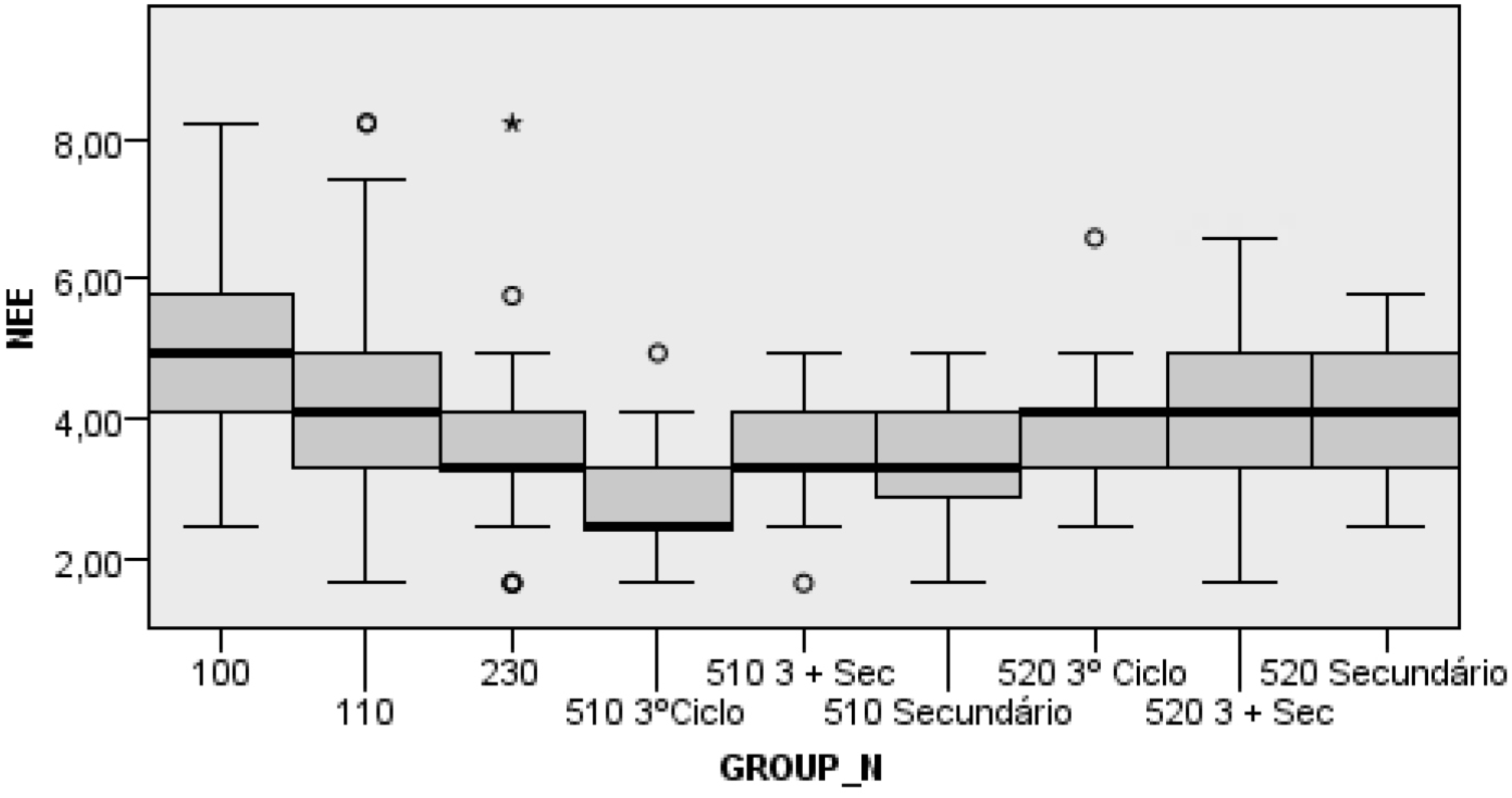 With regard to factor E, the results exposed a statistically significant fluctuation K(8)=45,153, p<0.001. Multiple comparisons highlighted the statistically significant difference between the 510 3rd CBE + secondary group and the 230 group (K=-4.352, p<0.001). Regarding the NES factor, the results also showed a statistically significant fluctuation K (8)=43.505, p<0.001, with emphasis on the comparison between the 510 3rd CEB group and the 110 group (K=-4.501, p<0.001). With regard to the NEO factor, a statistically significant fluctuation was also found between groups (K(8)=59,566, p<0.00), highlighting the difference with statistical significance between the 510 3rd CBE and 100 (K=-5,813 p<0.001). Regarding the NET factor, the result of the inference test also showed a statistically significant fluctuation (K(8)=30,076, p<0.001), with particular emphasis on the significant difference between group 100 and group 110 (K=-5,128 p<0.001).