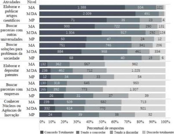 Em relação às atividades de pesquisa aplicada e inovação tecnológica, a percepção dos egressos é negativa, uma vez que, em média, 43% discordaram totalmente que receberam estímulo para elaborar e depositar patentes, para buscar parcerias com empresas e para conhecer núcleos ou agências de inovação tecnológica. Tais atividades são indispensáveis para o ensino superior contemporâneo, onde as IES são consideradas fonte de empreendedorismo, tecnologia e inovação, dedicadas à pesquisa crítica, educação, preservação e renovação do patrimônio cultural (Assad; Martins, 2008; Etzkowitz, 2013).