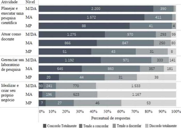 Outra questão, “A formação que você recebeu na sua pós-graduação o (a) preparou para”, buscava entender a percepção dos egressos em relação ao preparo que receberam durante os cursos de pós-graduação para executar determinadas atividades, que tinham relação direta com atividades de pesquisa (planejar e executar uma pesquisa científica, e gerenciar um laboratório de pesquisa), com atividades de docência (atuar como docente) e com atividades de empreendedorismo (idealizar e criar seu próprio negócio). Essas opções foram selecionadas de acordo com as principais atividades exercidas pelos cientistas no Brasil, principalmente com foco na pesquisa e docência (Botomé; Kubo, 2002; Moreira; Velho, 2012) e com a abordagem mais recente do “cientista inovador” (Etzkowitz, 2013; Faix; Mergenthaler, 2015).