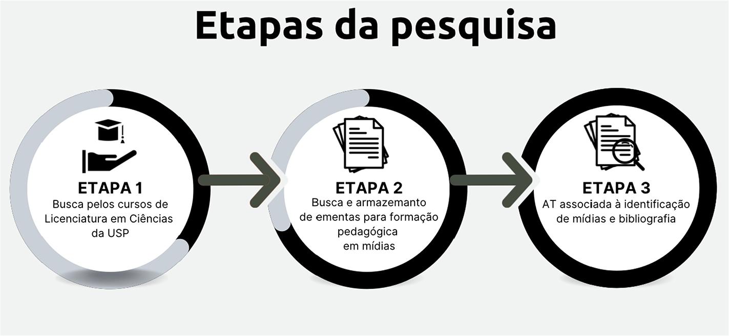 A segunda etapa da investigação envolveu a identificação das ementas dos referidos cursos voltadas à formação pedagógica que tangenciam ou abordam completamente temas relacionados a mídias diversas (de livros didáticos à inteligência artificial). Essa etapa foi conduzida entre os dias 24 e 26 de julho de 2023. Concluída a identificação das ementas, elas foram armazenadas em um banco de dados digital.