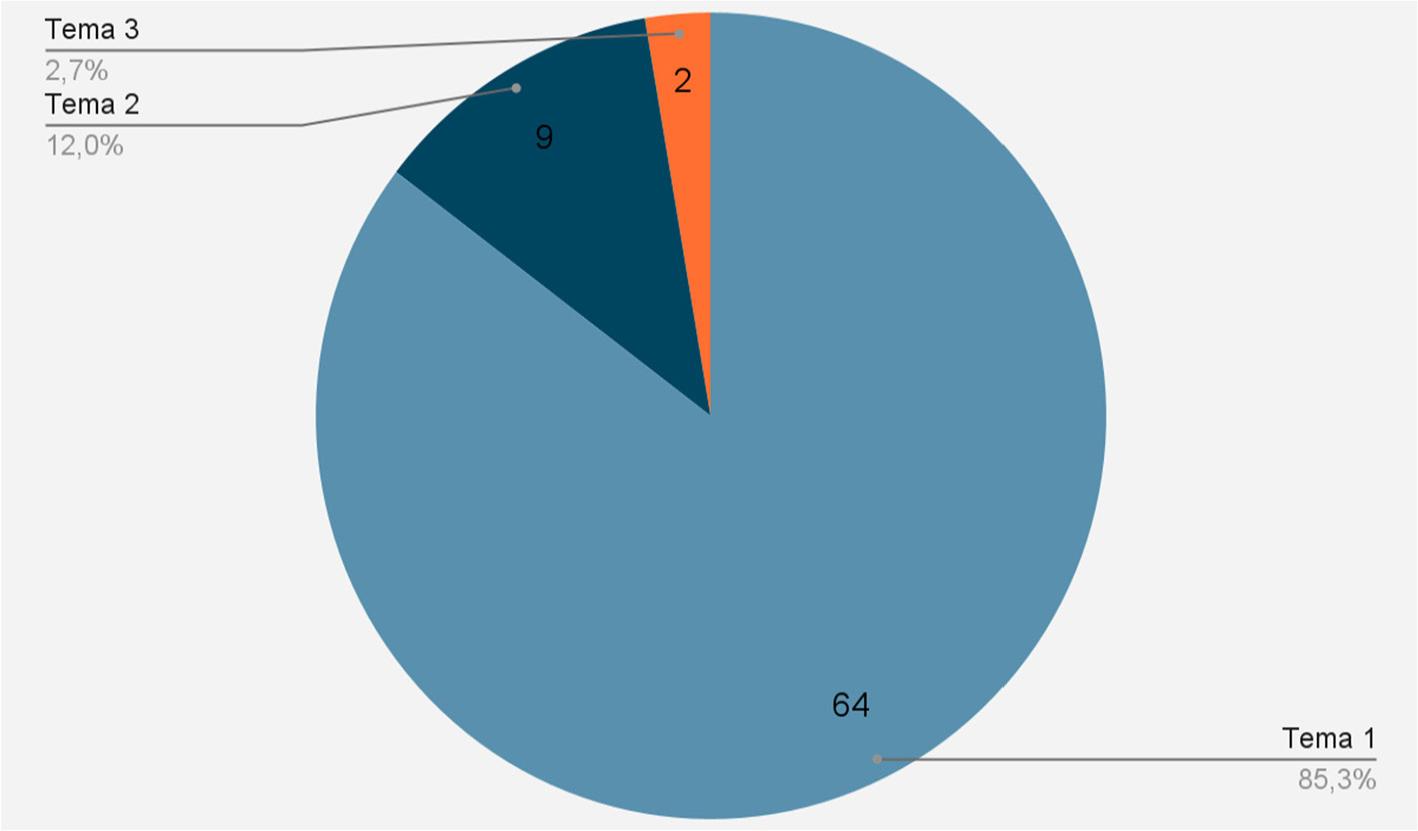 A figura 2 mostra a distribuição percentual das ementas em função de cada um dos três temas. Em seguida, são apresentados exemplos de ementas para cada um dos temas.