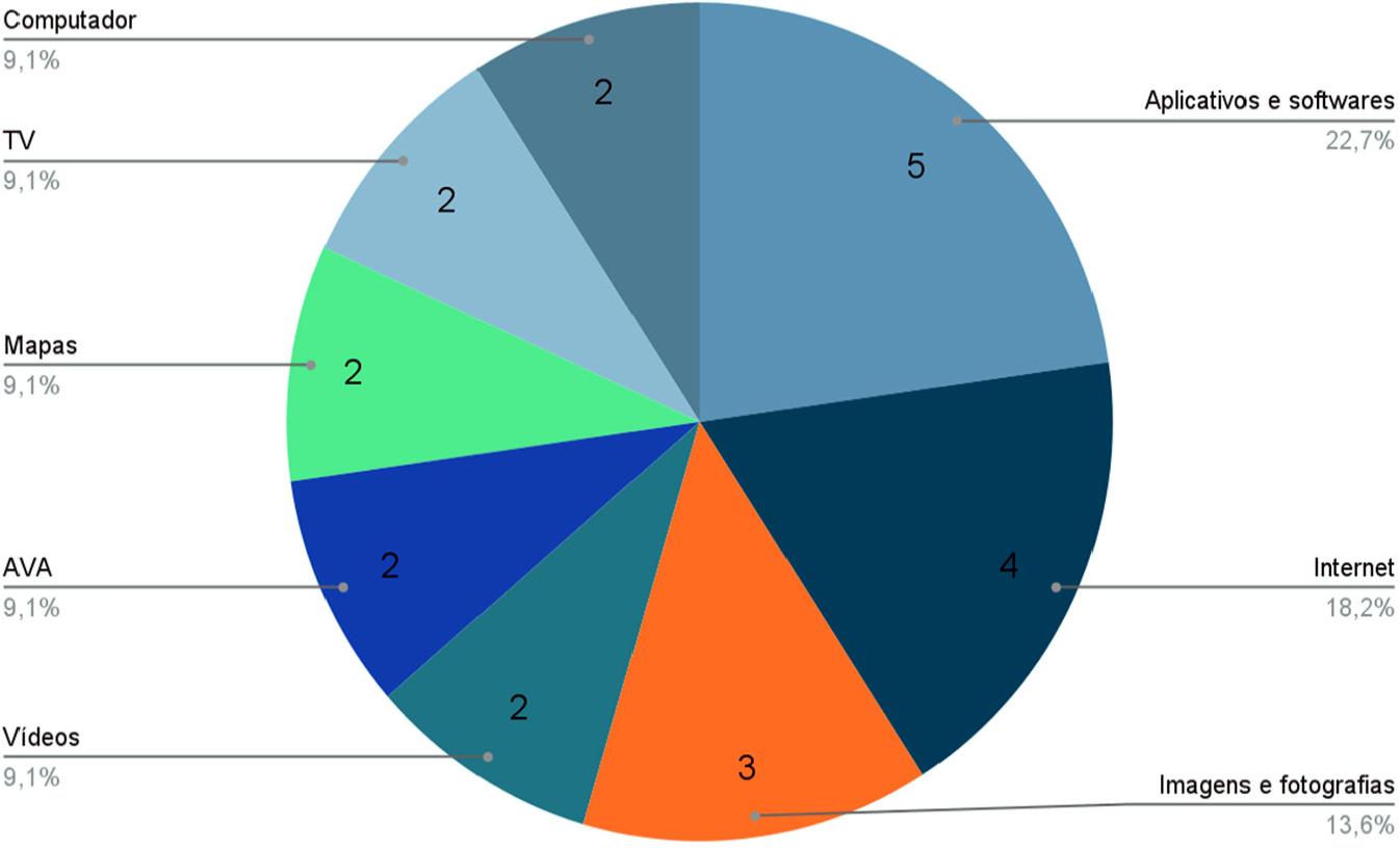 As mídias mais mencionadas nos nove documentos são os aplicativos e softwares computacionais, com instrumentalização prevista em cinco ementas. Ao contrário do tema anterior, os livros didáticos não estão entre os mais citados. São considerados em apenas uma ementa.