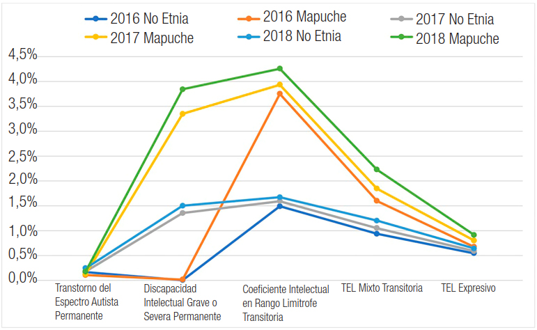 Al observar la Figura 2, puede constatarse que, persistentemente a lo largo del tiempo, las NEE discapacidad intelectual grave o severa permanente, coeficiente intelectual en rango limítrofe transitoria, TEL mixto transitoria y TEL expresivo son mayormente diagnosticadas a quienes se identifican como mapuches. Por ejemplo, la NEE coeficiente intelectual en rango limítrofe transitoria en el año 2016 para el caso de los no etnia llega a un 1,5%, mientras para estudiantes mapuches alcanza el 3,8%. Para el año 2017, la misma NEE en análisis (CI en rango limítrofe) confirma que la población no etnia llega al 1,9%; mientras que la identificada como mapuche al 4%. Y, para el año 2018, la misma NEE en los no etnia llega a un 1,7% de niños diagnosticados, mientras que en aquellos identificados como mapuches alcanza un 4,3% de diagnosticados -mostrando una persistente duplicación en la cantidad de diagnósticos.