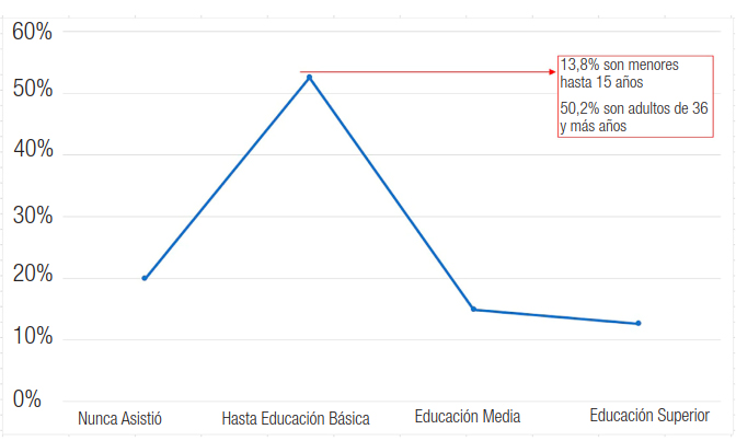 En Alto Biobío, la mayoría de la población declarada10 -que asciende al 59%- habla y entiende su lengua originaria (pehuenche); el 13,1% asegura solo entenderlo, y el resto de los habitantes, declarado mapuche, no lo habla ni comprende (Casen, 2017). En este aspecto, es relevante destacar que el 23% de la población que nunca asistió a una institución educacional declara hablar o entender el idioma originario. De igual manera, del total de quienes tienen como máximo nivel educacional a la educación básica, la mayoría (53,6%) maneja o entiende el idioma originario. La mayoría de quienes tienen cursada la educación básica y comprenden la lengua originaria son mayores de edad. Esto aterriza en una tendencia a la disminución en el manejo de la lengua según nivel de educación formal -representado en la Figura 3. En otras palabras, a mayor educación formal, menor nivel de mapudungún, implicando un uso substractivo de la lengua originaria por parte de la educación convencional de la zona, con efecto lingüicista: son quienes menos hablan quienes alcanzan un mayor nivel de educación formal.