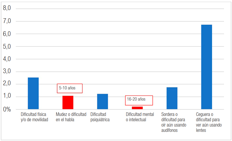 Como primer hallazgo, al indagar en el ámbito de dificultades de salud, mientras la mayoría de las personas declaradas asegura no tener dificultades de salud, es de notoriedad que el 100% de los casos reportados de mudez o dificultad del habla son identificados en niños de entre 5 y 10 años (Casen, 2017)11 -alcanzando el 1,1% del total de niñas y niños de dicho rango etario12- (Figura 4). Este rango etario coincide, además, con la etapa de ingreso escolar y entonces activación de las expectativas y mecanismos de ajuste de los estilos de lengua y comunicación hacia su semejanza a los estándares de normalidad escolar, incluyendo procesos de patologización, diagnóstico y socialización de estos a las familias, en búsqueda de aceptación y adherencia.