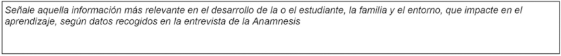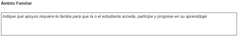 Esta participación limitada de cuidadores y comunidades en estos procesos de diagnósticos, que tiene por efecto impedir que puedan decidir sobre los regímenes de lengua y comunicación que se aplican a sus hijos, no es anecdótica, sino cuya prescripción pudo identificarse en el documento Formulario Único de Ingreso [FUDEI] (ex-Formulario Único Evaluación de Ingreso) (Chile, 2019). Para que las escuelas públicas de todo el país -incluidas aquellas bajo el PEIB- impetren el voucher por educación especial, los profesionales deben completar y responder a este documento. En este se consulta sobre la lengua habitual del/la estudiante (Figura 5) e incluye a las familias solo en tres aspectos: (a) como fuente de información a petición de profesionales escolares bajo eventual “impacto en el aprendizaje” (Chile, 2012) -sustentado en el modelo médico (Figura 6)-; (b) como base de aspectos que “favorecen” o “dificultan” el aprendizaje -valoración interpretada por el trabajador PIE (Figura 7)-; y (c) como ámbito de apoyos para entregar, a fin de que la o el estudiante “acceda, participe y progrese en su aprendizaje” (Figura 8) -excluyendo a las familias y comunidades de opinar sobre las necesidades de cada ámbito del estudiante en evaluación. Todo lo anterior delimita unilateralmente las posibilidades de participación de las familias y produce como inexistentes a las comunidades en los procesos de sus propios niños y niñas, constituyendo así a este mecanismo del PIE como estructura lingüicista.