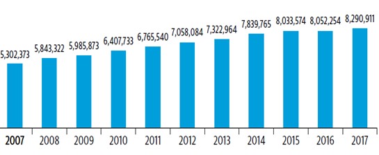 Dados de 2017 mostram que nosso sistema é composto por 2.448 IES, constituídas por universidades, centros universitários, faculdades e institutos federais tecnológicos. Das matrículas atuais, 54% estão nas universidades públicas e particulares. O Gráfico 1 mostra a evolução do número de matrículas no Ensino Superior no período de 2007 a 2017: