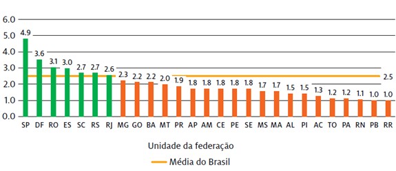 No Gráfico 2, mostramos a relação da matrícula privada/pública por estado. A média no Brasil é de 2,5 matrículas na Educação Superior privada em relação à pública. O estado de São Paulo é o que apresenta a maior relação, 4,9, seguido do Distrito Federal com 3,6. No caso do estado de Sergipe, é apresentada a média de 1,8.