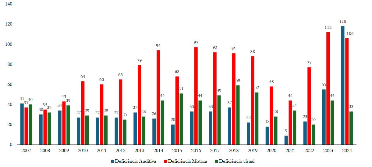 Gráfico 2 Total de casos de violência por tipo de deficiência (auditiva, motora e visual) de 2007 a 2024