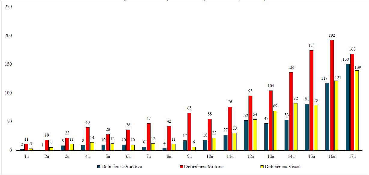 Gráfico 4 Quantidade de crimes por faixa etária e tipo de deficiência (2007 a 2024)