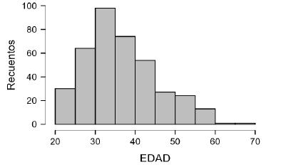 Se analizó la variable de edad (en años) de los estudiantes (N = 386). Los resultados indicaron una edad media de 37.0 años (DE = 8.9), con una mediana de 36 años. La moda fue de 32 años. Las edades oscilaron entre 21 y 67 años. En la Figura 1 se observa que la distribución de las edades tiene un pico principal alrededor de la treintena de años. Esto sugiere que el programa de Maestría en Educación tiende a atraer principalmente a profesionales de mediana edad, aunque incluye algunos participantes significativamente más jóvenes o mayores a los cuarenta años.
