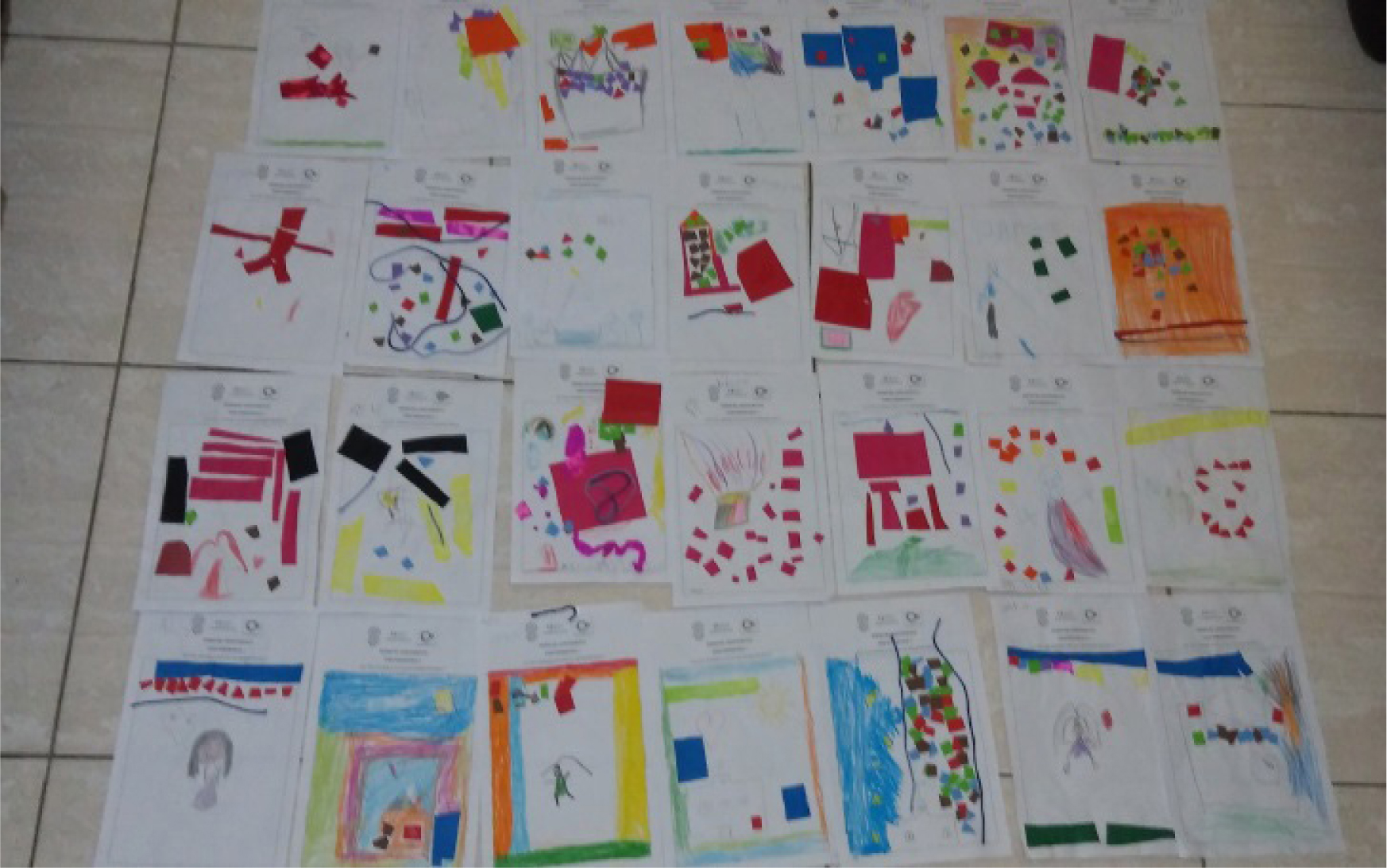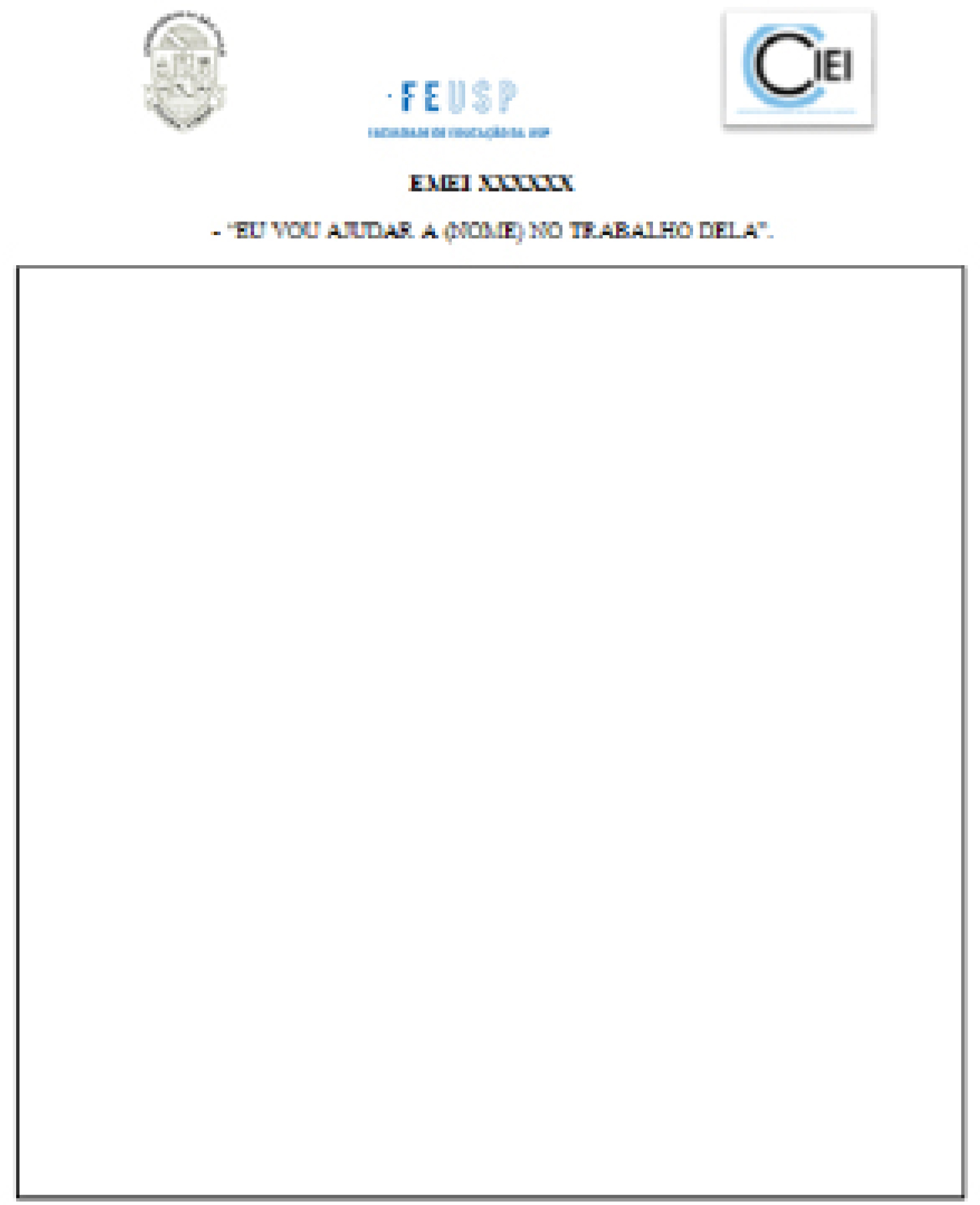 Para a produção da "Arte de Assentimento", eu levei às turmas a matriz preparada (Figura 1), li a frase escrita e apresentei o material a ser disponibilizado para a atividade, deixando-as livres para escolher o que utilizar e o que fazer. Elas perceberam ali que poderiam extrapolar o desenho e o colorido com giz de cera. Demonstraram excitação na manipulação do material, que incluía papel crepom, papéis coloridos, linha de lã, tesouras, lápis de cor, giz de cera, canetinhas e cola. Todos os itens foram organizados em uma mesa, à qual cada criança se dirigia para escolher o que utilizar. As falas e os risos expunham prazer na tarefa, e mais tempo foi pedido para a sua conclusão. Cada criança escolheu onde colocar seu nome, e algumas solicitaram auxílio para escrevê-lo.