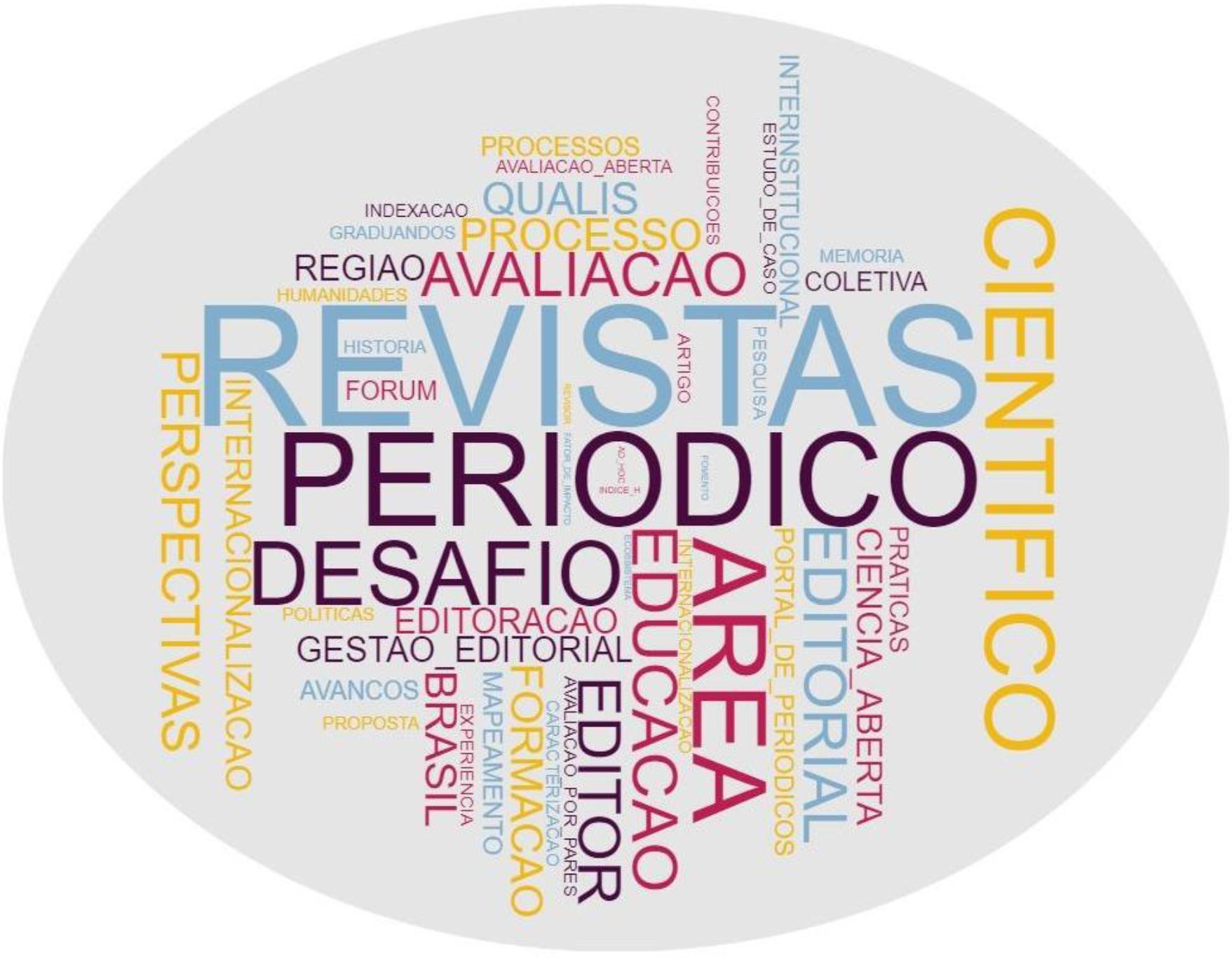As palavras “periódico”, “Educação”, “revistas”, “área”, “científico” e “desafio” foram as mais prevalentes e ocupam o eixo central na nuvem de palavras. Pelo exposto, tais recorrências estão alinhadas com os objetivos do FEPAE, fórum ao qual o Congresso é vinculado. Salienta-se ainda que a esses temas centrais somam-se outros como avaliação, gestão editorial, editoração e formação.