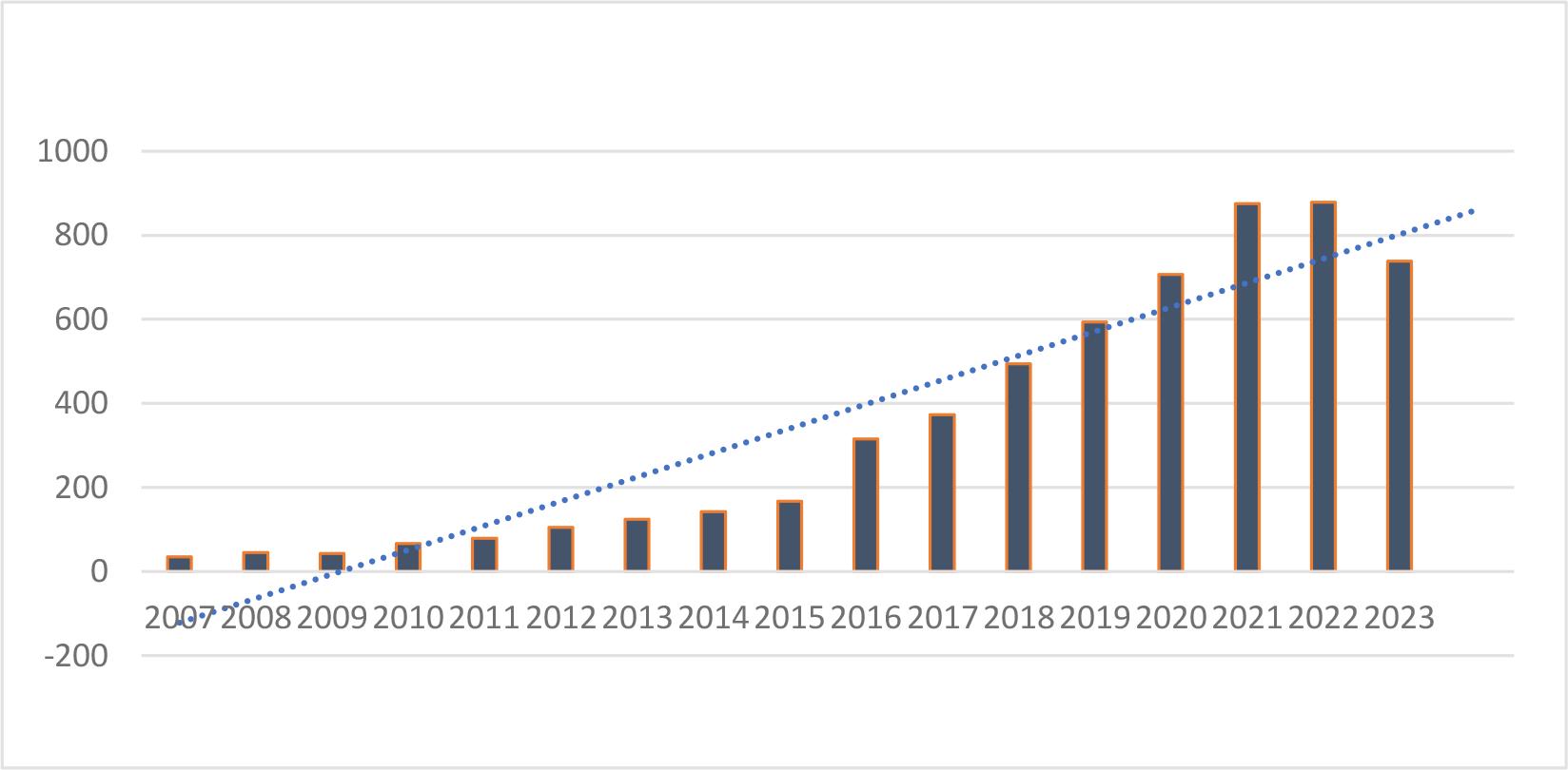 Nota-se que, nesse tempo de 16 anos, houve uma tendência de variação ascendente das citações dos artigos de autores brasileiros e estrangeiros, quando se compara o ano de 2007 (35) com o de 2023 (739), o que alça a Revista a uma sequência de variação progressiva de citações próxima a uma média de 23% ao ano.