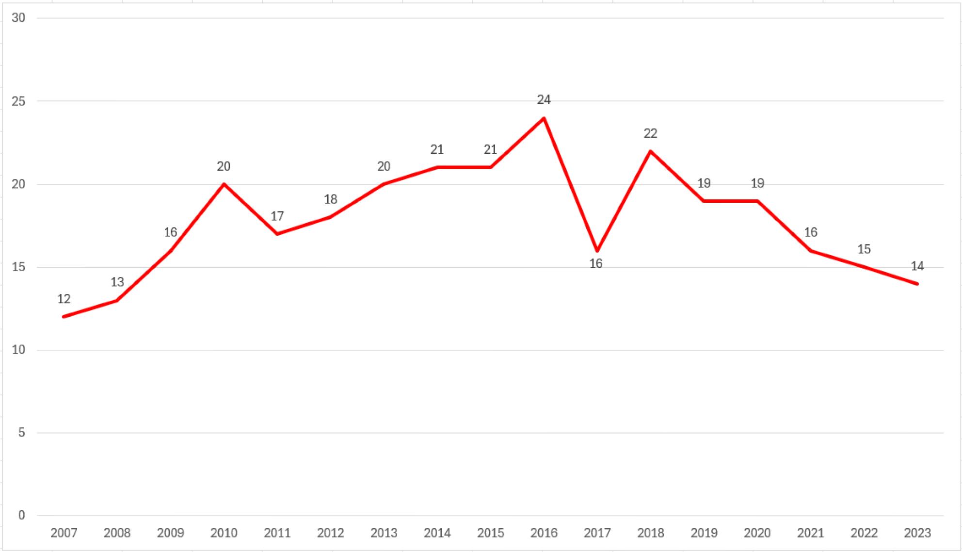 A par das métricas estimadas no gráfico 2, a variação das citações, nesse tempo de 16 anos (2007-2023), por seu lado, assinala uma tendência de oscilação para cima no comportamento ano a ano, a exemplo de 2010 a 2018: 20; 17; 18; 20; 21; 24; 16 e 22.