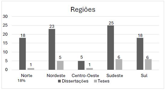 Nesse contexto, as regiões nordeste (26%) e sul (22%) evidenciam um avanço nesses estudos, tanto em nível de mestrado, quanto de doutorado. Porém, o expressivo número de pesquisas em mestrado não representa a continuidade desses trabalhos no doutorado, quando analisamos a quantidade de forma equiparada entre mestrado e doutorado. Já a região norte (18%), aparece na sequência com expressivo número de pesquisas de mestrado e somente uma pesquisa em nível de doutorado, o que pode indicar a ausência de programas de pós-graduação stricto sensu em nível de doutorado.