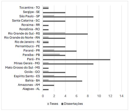 Dessa forma, observou-se uma predominância das pesquisas na região sudeste, particularmente, nos estados de Minas Gerais, Espírito Santo e São Paulo como lócus da produção e divulgação do conhecimento sobre a temática. Na região norte, verificamos um destaque das pesquisas sobre a temática em cursos de mestrado no estado do Pará.