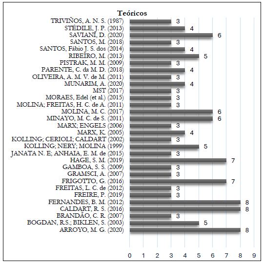 Quanto ao referencial teórico e metodológico presentes nas dissertações consideramos para a organização do gráfico os teóricos presentes em mais de 3 (três) pesquisas. Nesse aporte teórico, observamos que os autores mais utilizados foram Arroyo (2020)9, Caldart (2016) e Fernandes (2012) citado por 08 pesquisas; na sequência temos Hage (2019) e Frigotto (2016) citados por 07 pesquisadores; Molina (2017) e Saviani (2020) estão presentes em 06 trabalhos. Todos esses autores contextualizam a gênese do Movimento da Educação do Campo no Brasil.