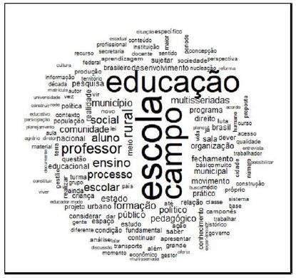 Assim, as palavras evidenciadas na nuvem de palavras acima foram educação, escola e campo que representam o cenário geral em que a temática escola multisseriada encontra-se vinculada. Num segundo agrupamento e em tamanho menor, identificamos as palavras processo, social, rural, ensino, escolar, professor e aluno. Já no terceiro agrupamento, constatamos as palavras multisseriada e fechamento que aparecem num tamanho menor, o que pode configurar um distanciamento dos trabalhos selecionados no que se refere à temática fechamento de escolas multisseriadas. Embora as pesquisas, em algum momento, ressaltem sobre o fechamento, a reflexão em sua abrangência engloba a Educação do Campo.