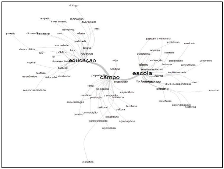 A análise de similitude permite visualizar vínculos entre os elementos textuais por meio da conexidade entre as palavras. Nesse sentido, quanto maiores forem as palavras, maior será a sua frequência e contribuição para a formação da árvore de conexões. As ramificações expressas na similitude nos possibilitaram observar, em linhas gerais, três eixos de discussão, já percebidos na nuvem de palavras, que se organizaram nos agrupamentos de escola, campo e educação.