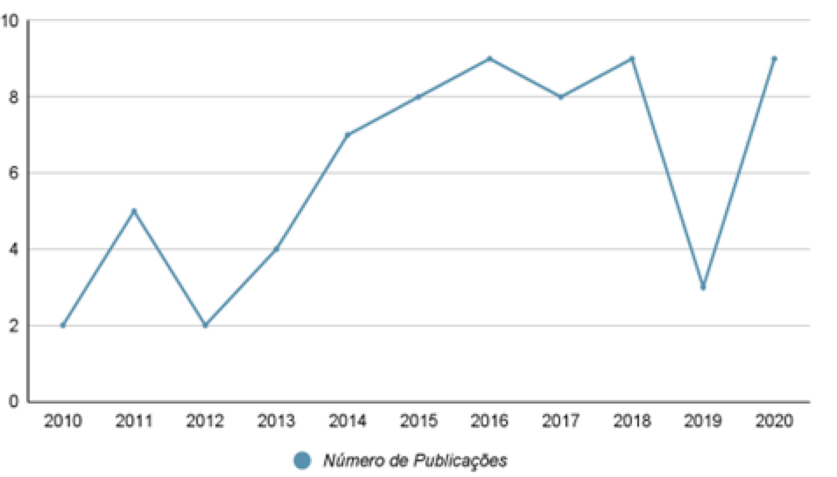 Com busca em assuntos pelo termo exato “Teoria das Inteligências Múltiplas” na categoria específica de artigos do período compreendido de 2010 a 2020, em todos os idiomas disponíveis, foram encontrados 73 itens nos parâmetros exigidos. Sete resultados de natureza editorial, porém, foram desconsiderados visando à manutenção da sistematização teórica do estudo (Gil, 2002). A distribuição dos artigos no decorrer do período considerado é mostrada na Figura 1.