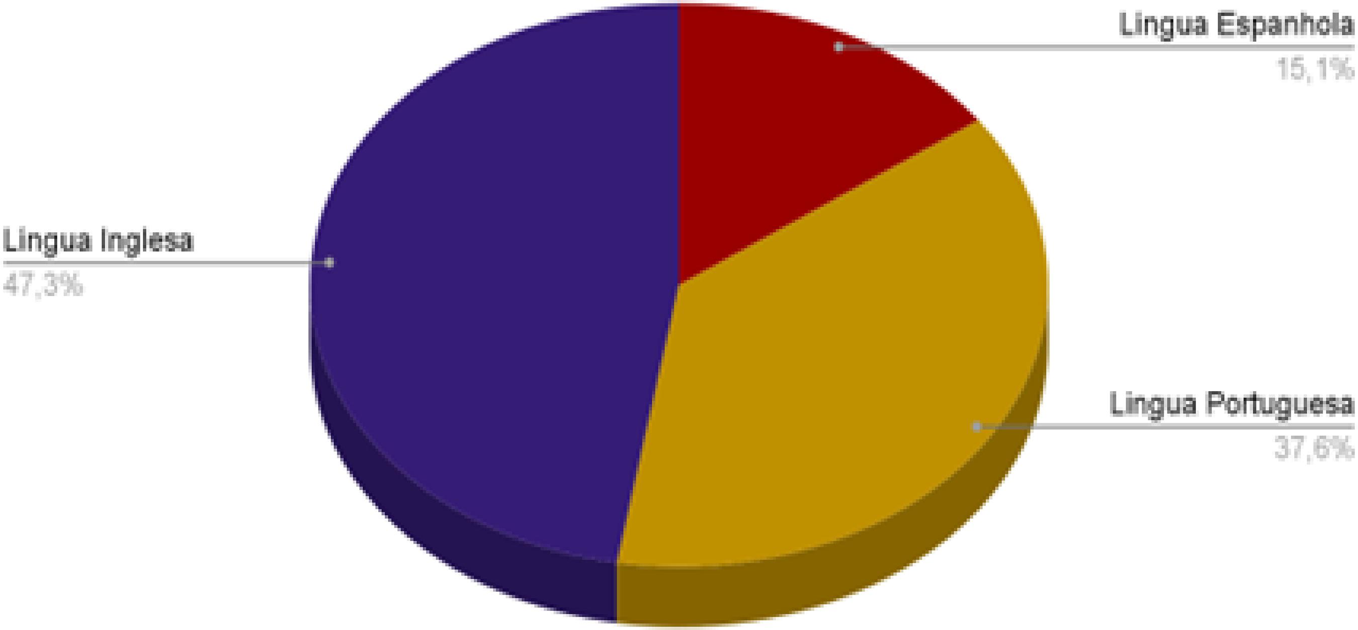 Durante a análise dos artigos encontrados, foi realizada uma tabulação dos idiomas de escrita, como mostrado na Figura 3, dada a presença de instituições de fomento internacionais e o alto fluxo informacional e técnico produzido majoritariamente em língua inglesa. Tal levantamento fornece subsídios para identificar tendências de produção no idioma nativo, o estabelecimento acadêmico do objeto de pesquisa em território nacional e realizar inferências mais assertivas, resultado de uma compreensão clara e bem delimitada (Volpato, 2000 apudPizzani et al., 2012).